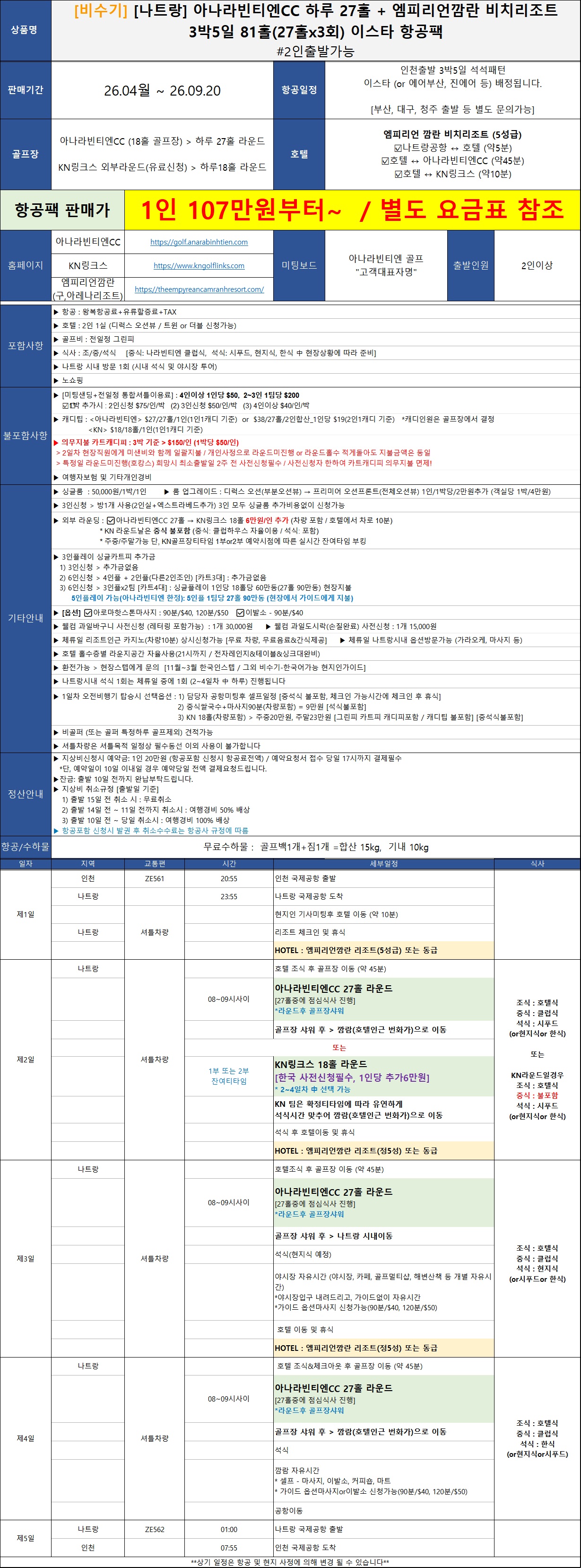 | - 2인부터 신청 - 1~2월한정 미샌비 인원상관없이 1인 50$ - 불포함: 미샌비, 카트+캐디피, 캐디팁 - 3인신청추가금없음(엑베사용) - 나라빈티엔한정 5인플가능(카트피추가) - 매일 스페셜석식 포함 / 나트랑 시내관광 포함