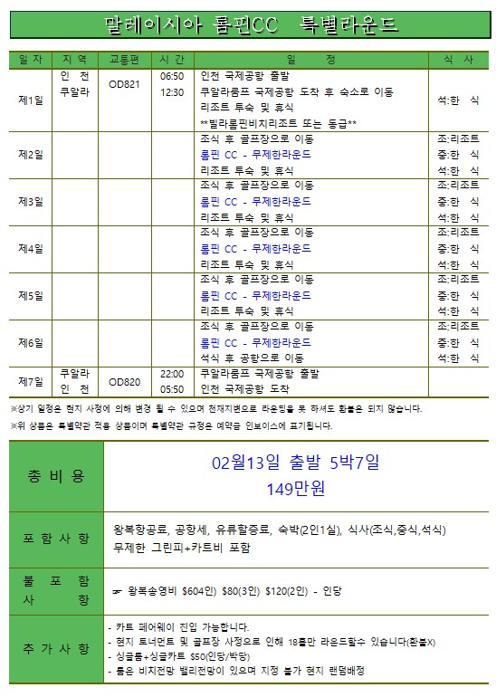 [말레이시아 조호바루] 설날연휴 2/13 출발 [5박7일] 무제한 플레이 - 롬핀 골프 리조트