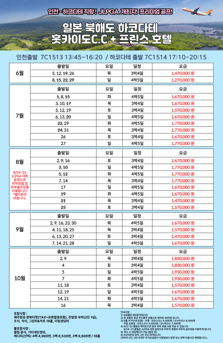 ▶ 7월 ~10월 : 목/토요일 3박 4일 // 화/일요일 4박5일 일정 // 화/목/토/일요일 7박8일