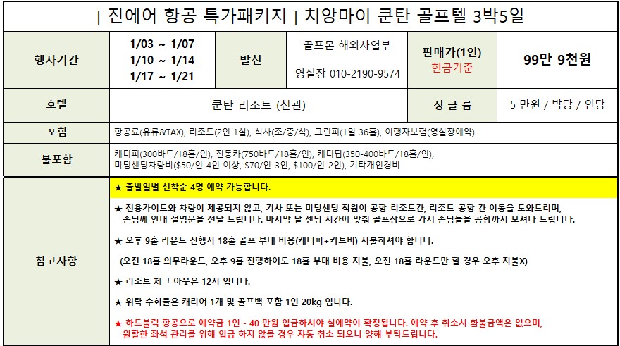 1월 10일 출발 3박5일 ▶ 999,000원