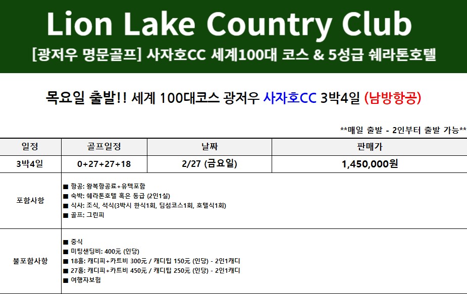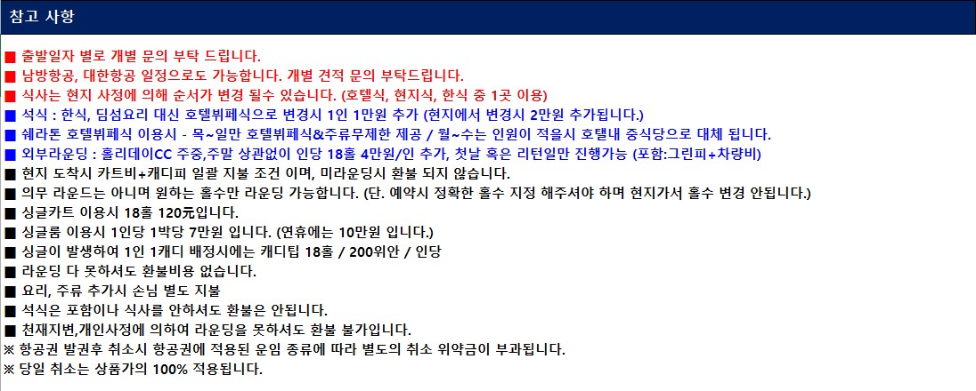 ■ 현지 도착시 카트비+캐디피 일괄 지불 조건이며, 미라운딩시 환불되지 않습니다.