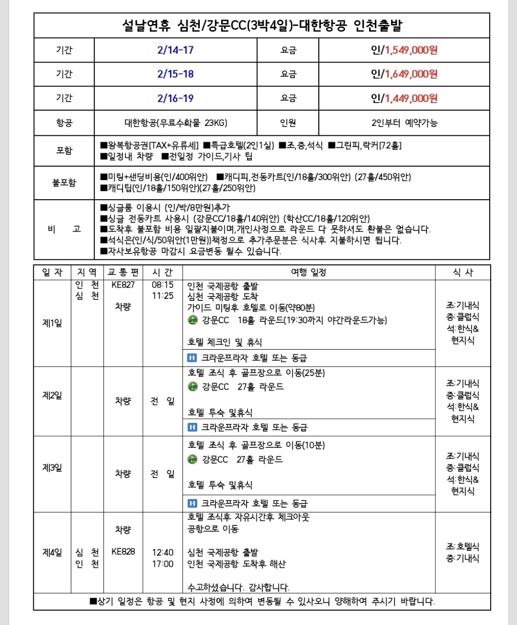 출발일 및 상품 가격 및 일정표
