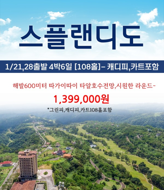 🏨스플랜디도 호텔 (Splendido Hotel) 스플랜디도 호텔은 필리핀 따가이따이(Tagaytay)의 청정한 자연 속에 자리한 고급 리조트형 호텔입니다. 아름다운 탈 화산 호수(Lake Taal) 전망과 함께, 편안한 휴식과 품격 있는 서비스를 즐기실 수 있습니다. 특히 골프 리조트로 유명해, 여유로운 라운딩과 프리미엄 숙박을 동시에 누릴 수 있는 최적의 공간입니다. ✨ 주요 특징 전망 좋은 객실 : 대부분의 객실에서 탈 화산과 호수를 조망할 수 있으며, 모던하면서도 따뜻한 인테리어로 꾸며져 있습니다. 레스토랑 & 카페 : 현지 특선 요리부터 인터내셔널 메뉴까지 즐길 수 있으며, 로비 라운지 카페에서 커피와 디저트를 곁들여 여유로운 시간을 보낼 수 있습니다. 골프 & 레저 : 18홀 챔피언십 골프코스를 보유, 초보자부터 프로까지 만족할 수 있는 환경을 제공합니다.수영장, 피트니스 센터, 마사지 서비스 등 다양한 편의시설이 마련되어 있습니다. | ||||||||