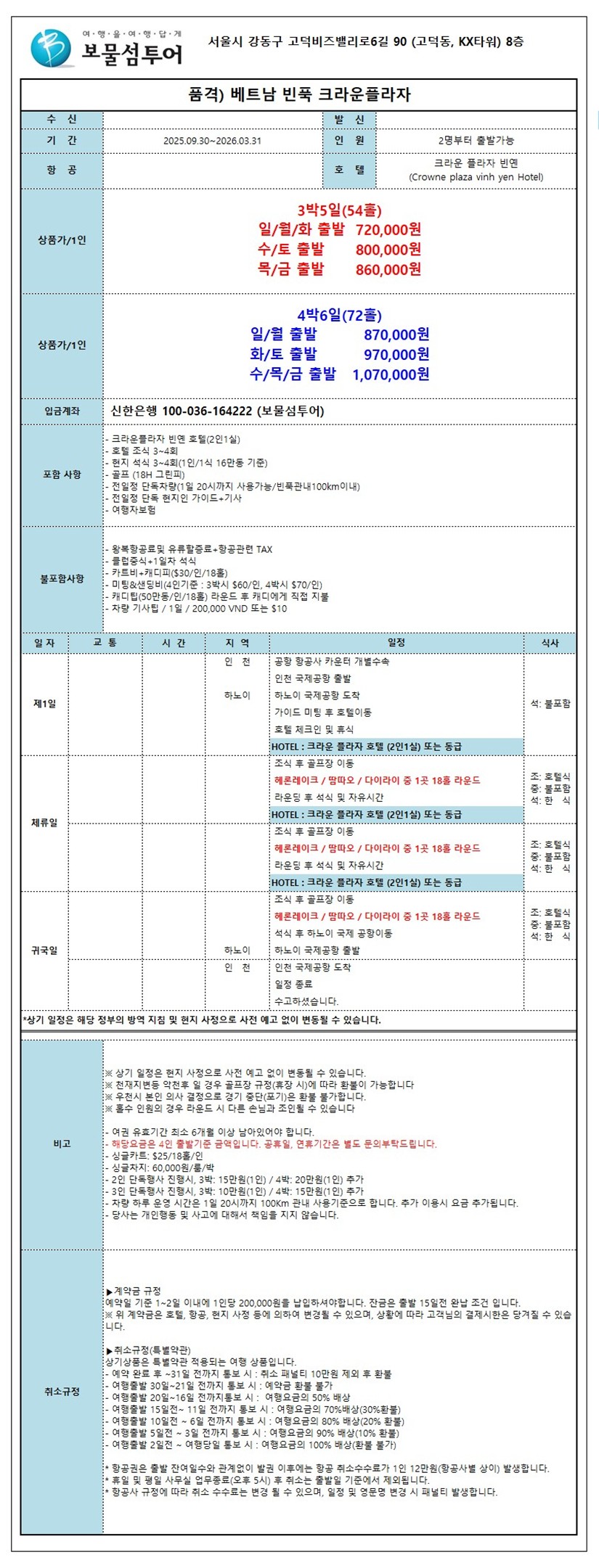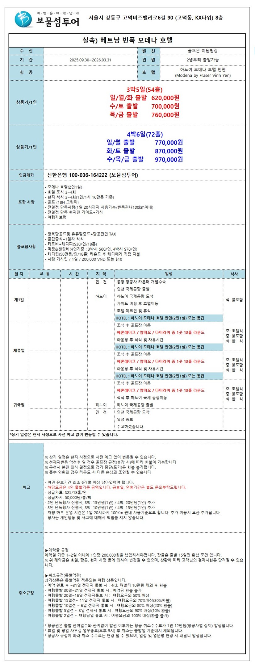 [3박5일(54홀)] 일/월/화 출발 970,000원 수/토 출발 1,050,000원 목/금 출발 1,110,000원 [4박6일(72홀)] 일/월 출발 1,120,000원 화/토 출발 1,220,000원 수/목/금 출발 1,320,000원