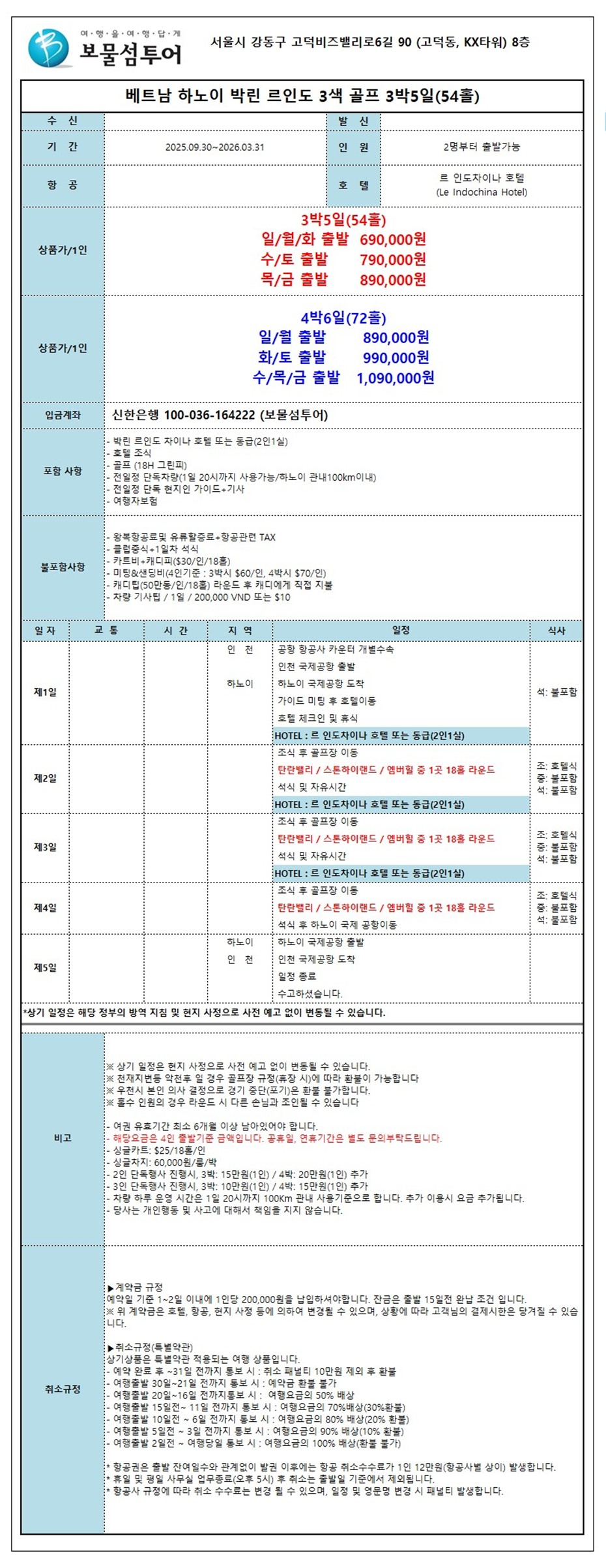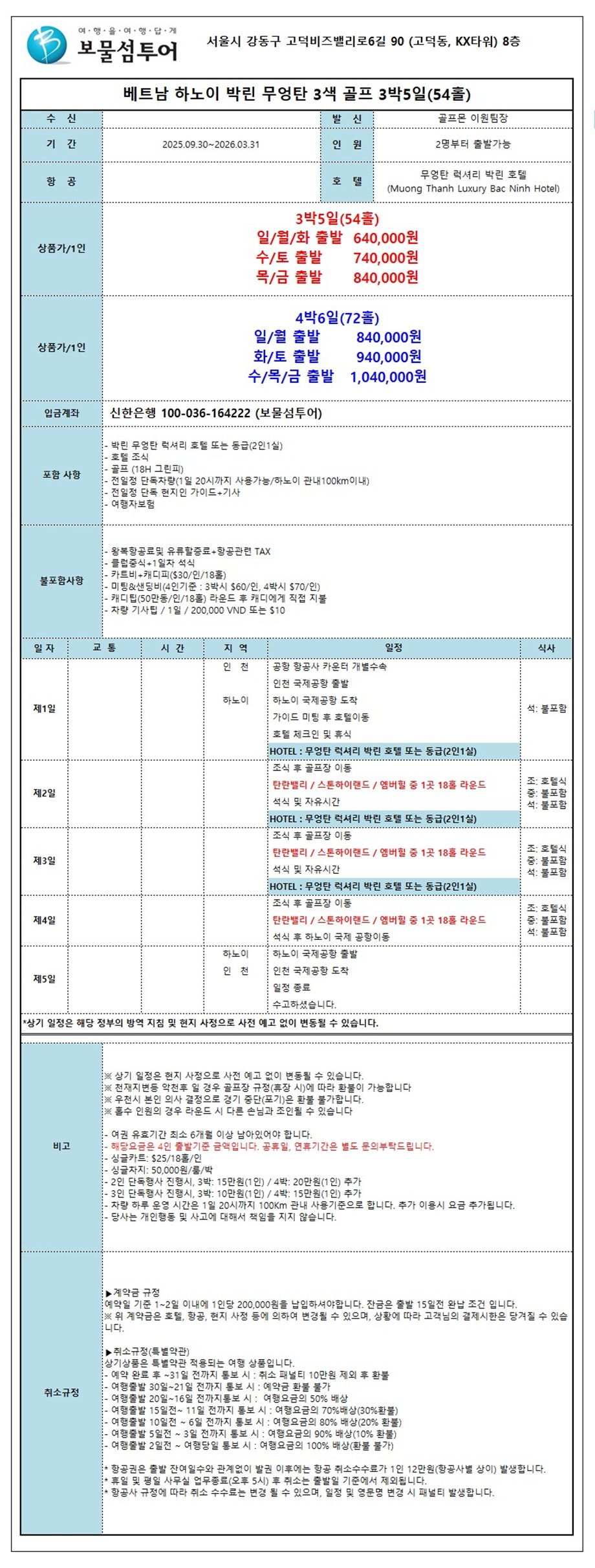 [3박5일(54홀)] 일/월/화 출발 990,000원 수/토 출발 1,090,000원 목/금 출발 1,190,000원 [4박6일(72홀)] 일/월 출발 1,190,000원 화/토 출발 1,290,000원 수/목/금 출발 1,390,000원