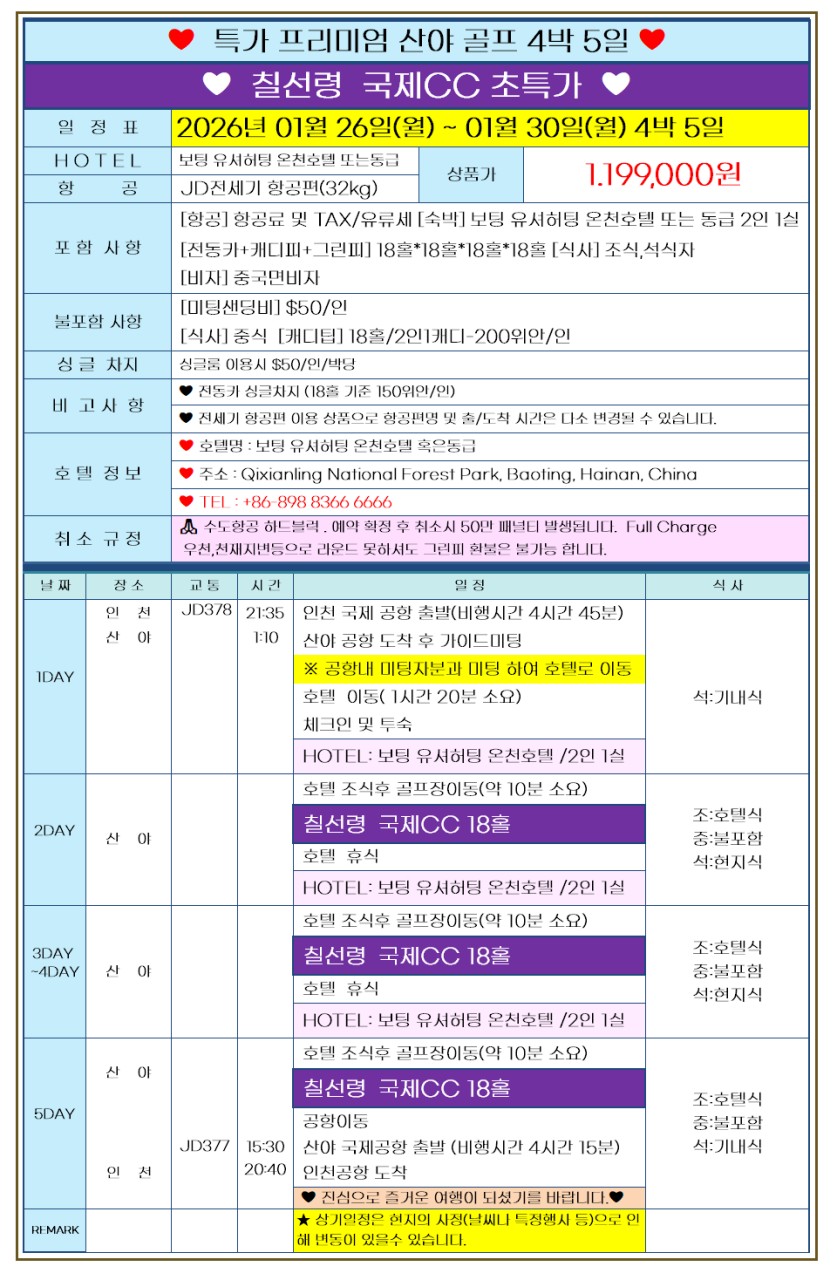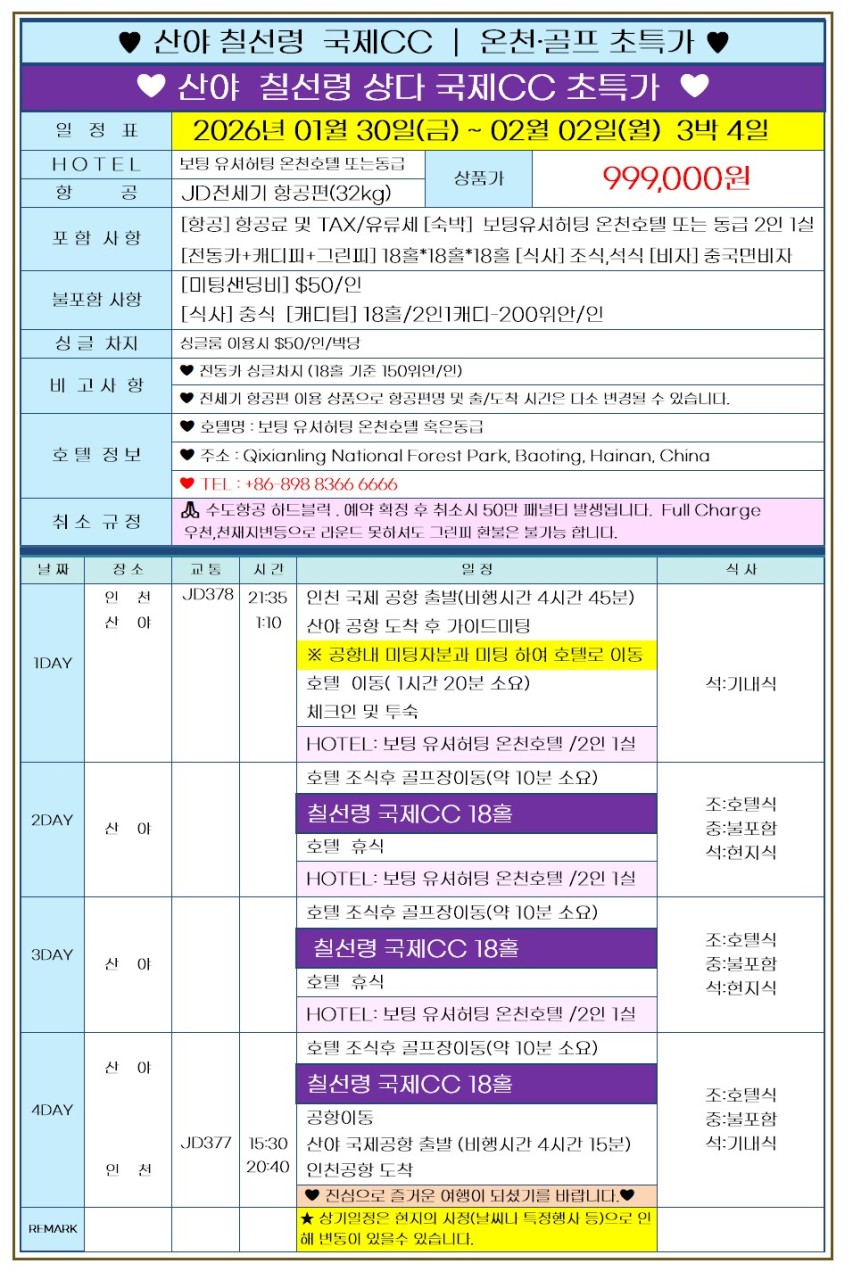 [하이난 싼야] 칠선령 국제CC - 온수풀 프라이빗 골프 패키지