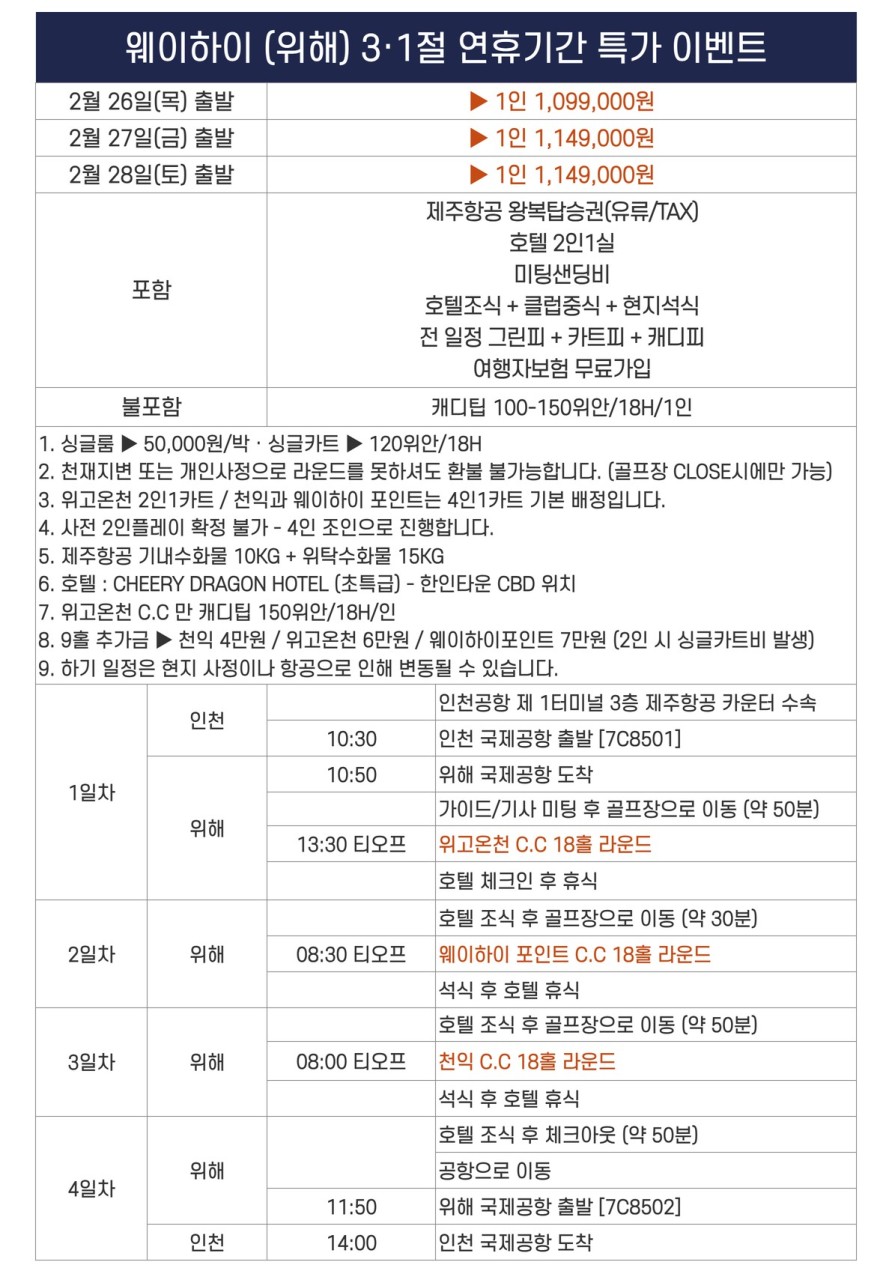 [웨이하이] 골프몬 3/1 연휴기간 한정특가 패키지