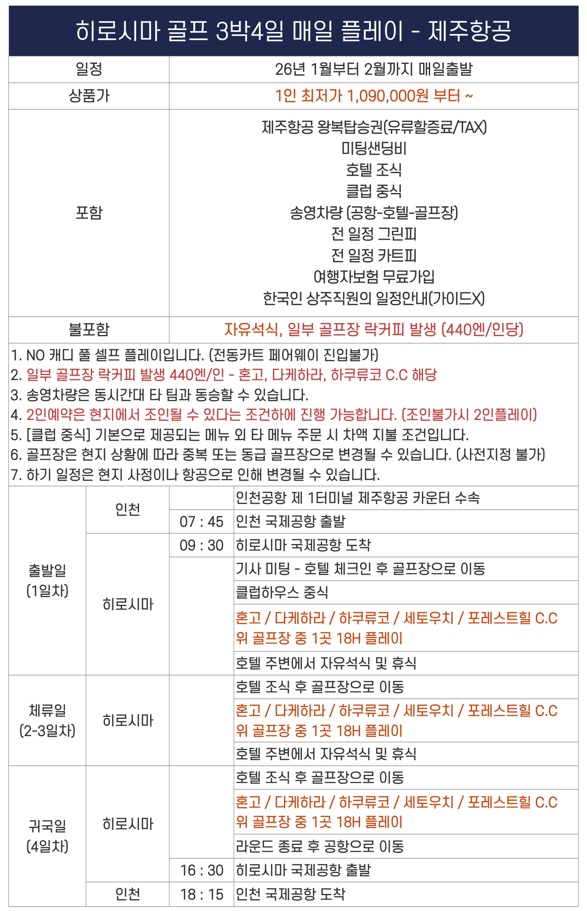[히로시마] 일정 낭비없이 매일 플레이하는 일본골프 - 구정연휴 특가포함