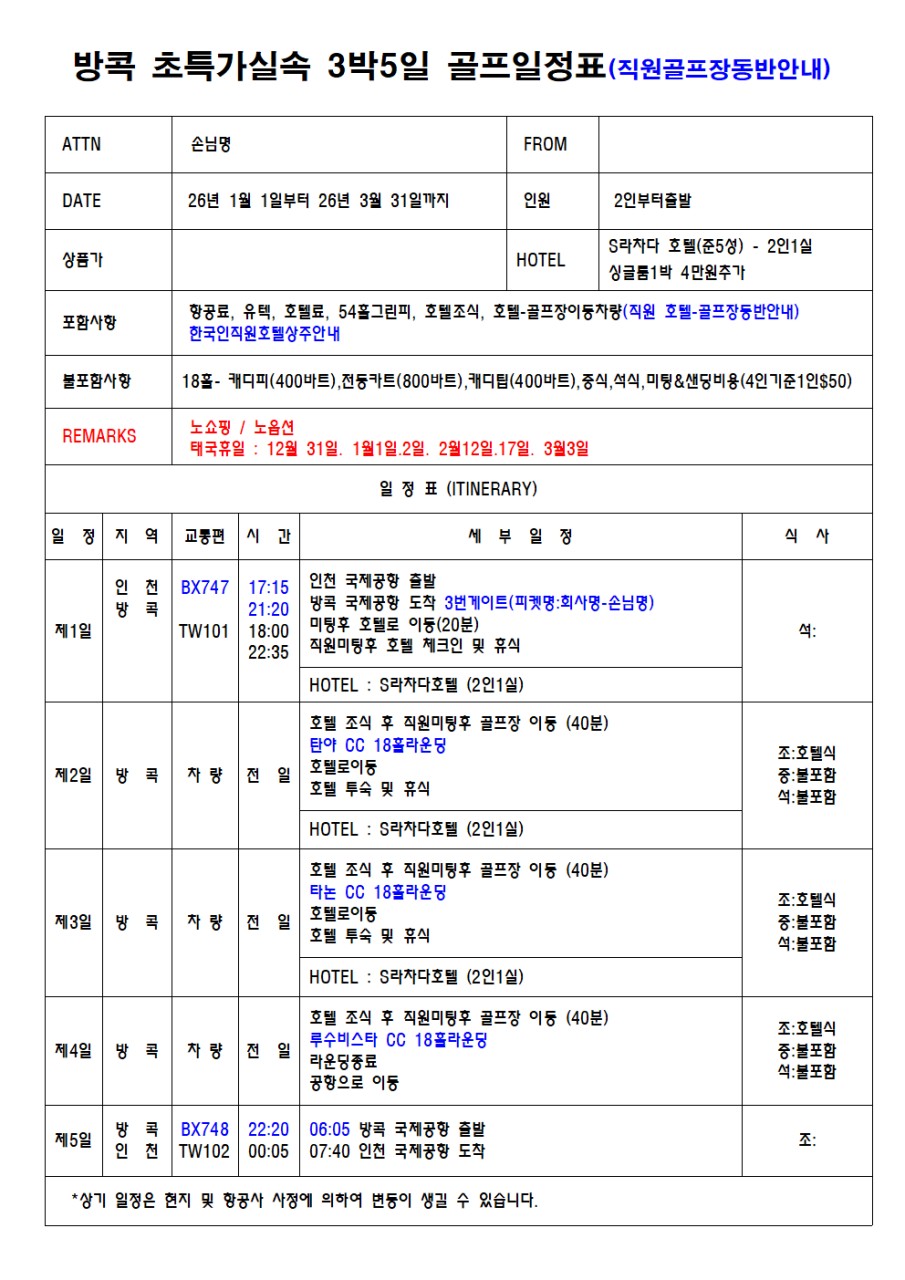 | ❌ 불포함사항 | 중식.석식 캐디피+전동카트(18홀 1,200바트) 캐디팁(18홀 400바트) 미팅&샌딩&골프장이동비용(4인기준1인$50)