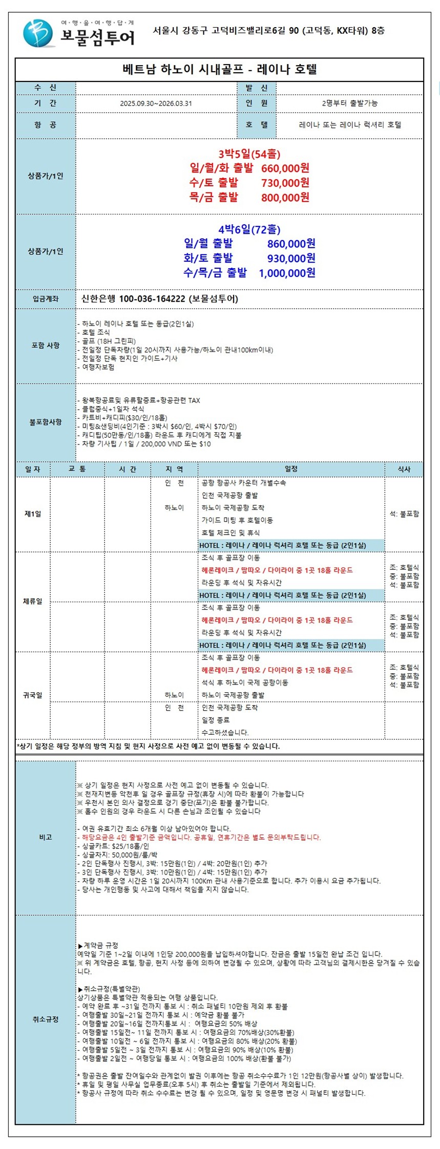 하노이 레이나 호텔 3색 골프 [3박5일(54홀)] 일/월/화 출발 1,010,000원 수/토 출발 1,080,000원 목/금 출발 1,150,000원 [4박6일(72홀)] 일/월 출발 1,210,000원 화/토 출발 1,280,000원 수/목/금 출발 1,350,000원