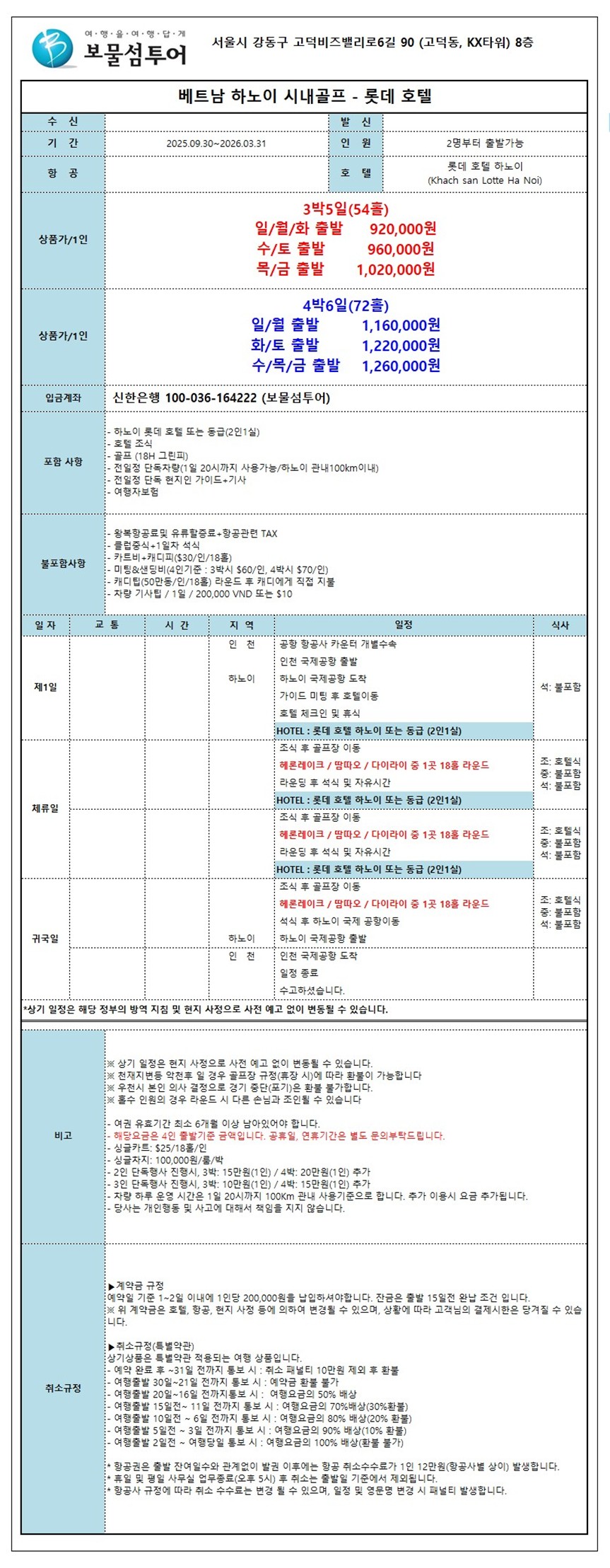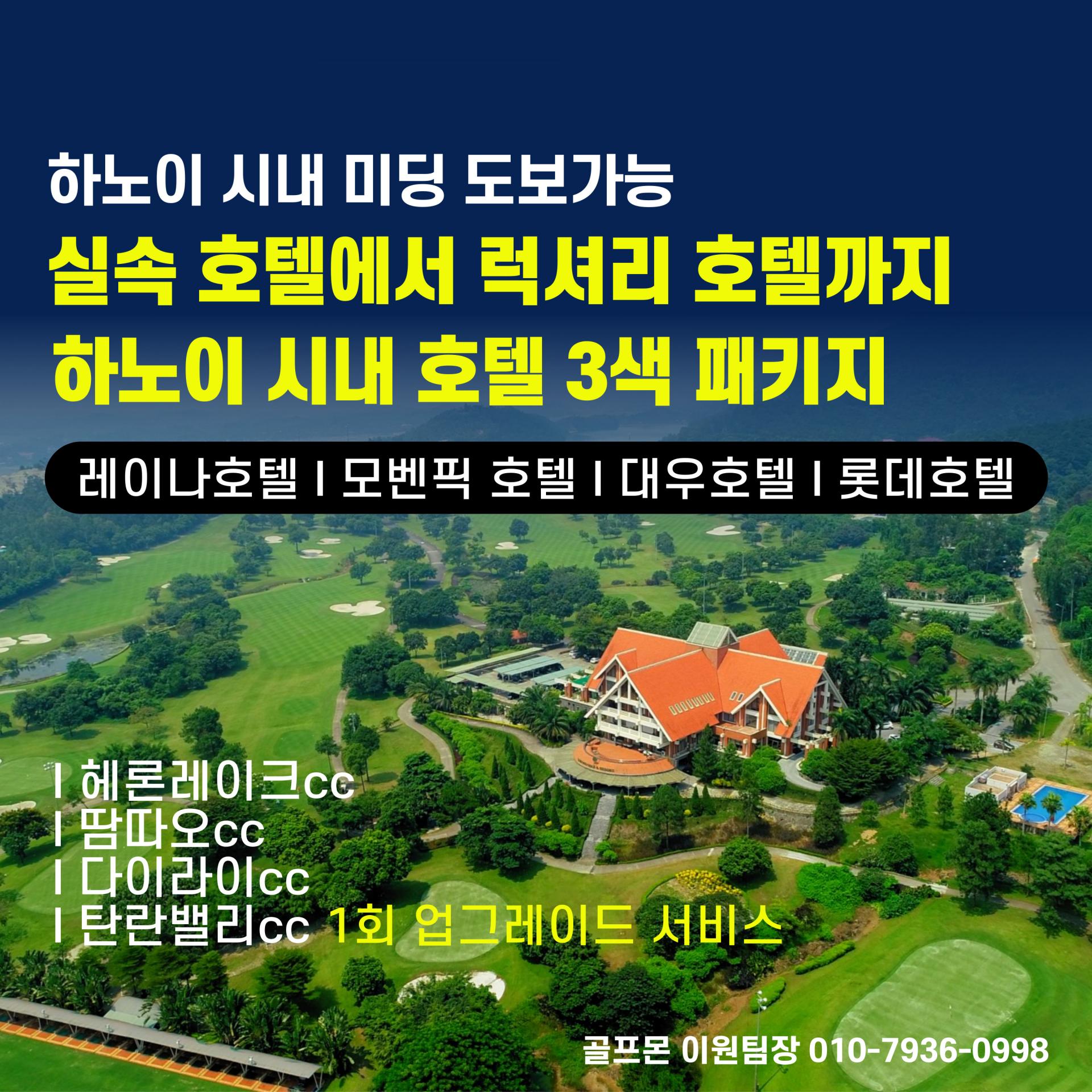 하노이 롯데 호텔 3색 골프 [3박5일(54홀)] 일/월/화 출발 1,270,000원 수/토 출발 1,310,000원 목/금 출발 1,370,000원 [4박6일(72홀)] 일/월 출발 1,510,000원 화/토 출발 1,570,000원 수/목/금 출발 1,610,000원 | ✈️ 항공 | 대한항공, 아시아나, 제주항공, 티웨이 운항하고 있습니다.