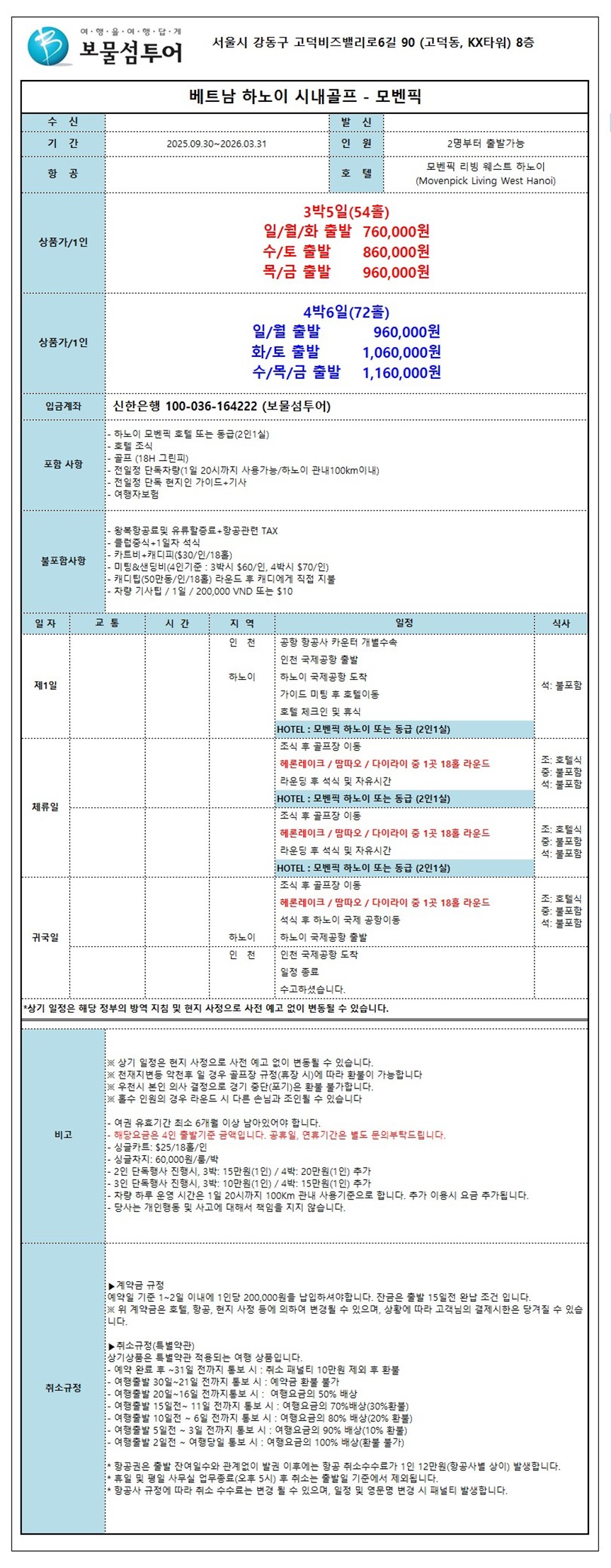 하노이 모벤픽 호텔 3색 골프 [3박5일(54홀)] 일/월/화 출발 1,110,000원 수/토 출발 1,210,000원 목/금 출발 1,310,000원 [4박6일(72홀)] 일/월 출발 1,310,000원 화/토 출발 1,410,000원 수/목/금 출발 1,510,000원 하노이 대우 호텔 3색 골프
