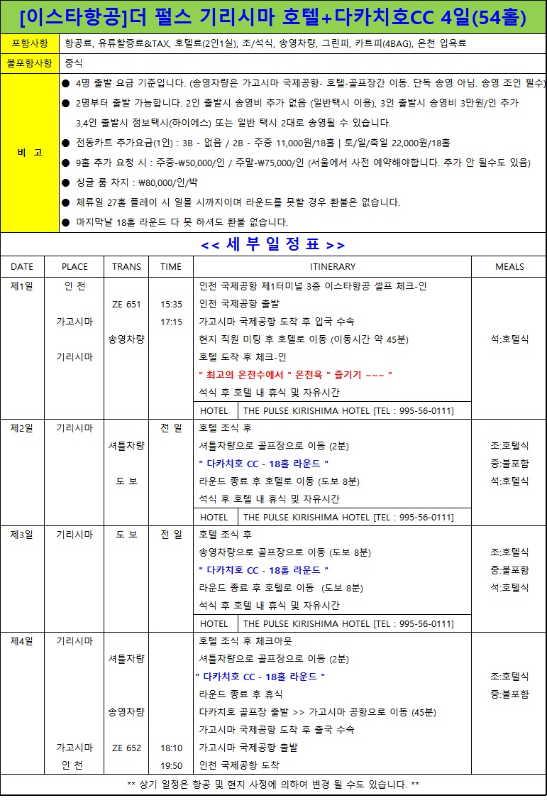 | 🚩 기타안내 | - 싱글 룸 차지 : \80,000/인/박 - 4명 출발 요금 기준입니다. (송영차량은 가고시마 국제공항- 호텔-골프장간 이동. 단독 송영 아님. 송영 조인 필수) - 2명부터 출발 가능합니다. 2인 출발시 송영비 추가 없음 (일반택시 이용), 3인 출발시 송영비 3만원/인 추가 - 3,4인 출발시 점보택시(하이에스) 또는 일반 택시 2대로 송영될 수 있습니다. - 전동카트 추가요금(1인) : 3B - 없음 / 2B - 주중 11,000원/18홀 | 토/일/축일 22,000원/18홀 - 9홀 추가 요청 시 : 주중-\30,000/인 / 주말-\30,000/인 (서울에서 사전 예약해야합니다. 추가 안 될수도 있음) - 마지막날 18홀 라운드 다 못 하셔도 환불 없습니다. - 체류일 27홀 플레이 시 일몰 시까지이며 라운드를 못할 경우 환불은 없습니다. - 골프장이 휴장 될 경우가 아닌 손님 변심으로 인한 NO PLAY 는 일체 환불되지 않습니다. - 조식 : 부페 // 석식 : 바이킹 뷔페 - 취소 시 출발 30일전부터 현지 취소수수료 발생합니다. - 본 상품은 예약 시점일 기준 항공 좌석 및 현지 호텔 상황에 따라 요금이 변경 될 수도 있습니다.