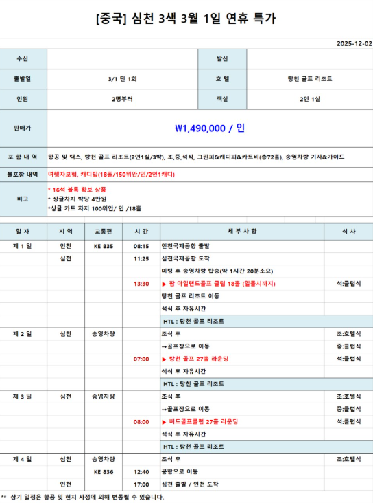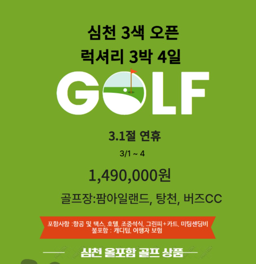 [심천골프] 신규 상품 심천 3색 골프 총 72홀 3월 1일 연휴 블럭 상품 초특가