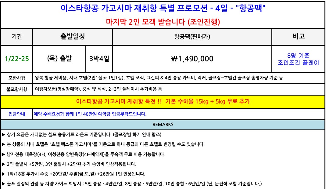 [가고시마] 1/22(목) 출발 마지막 2인 급모객(오늘마감) - 조인으로 진행합니다