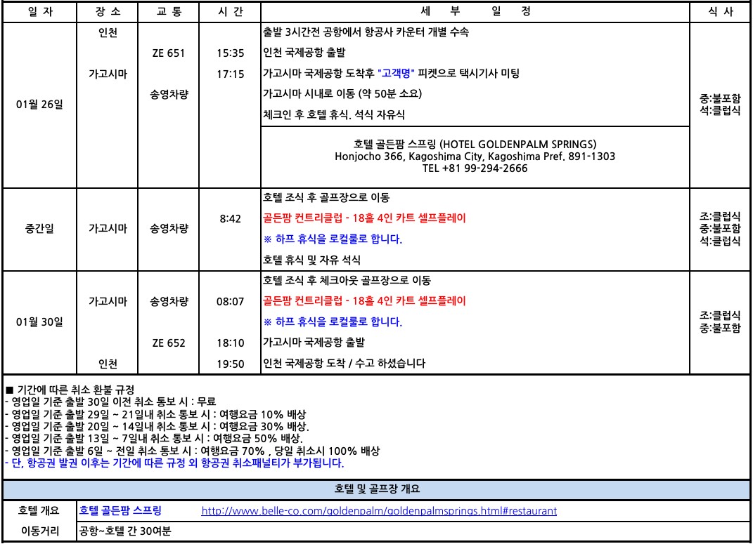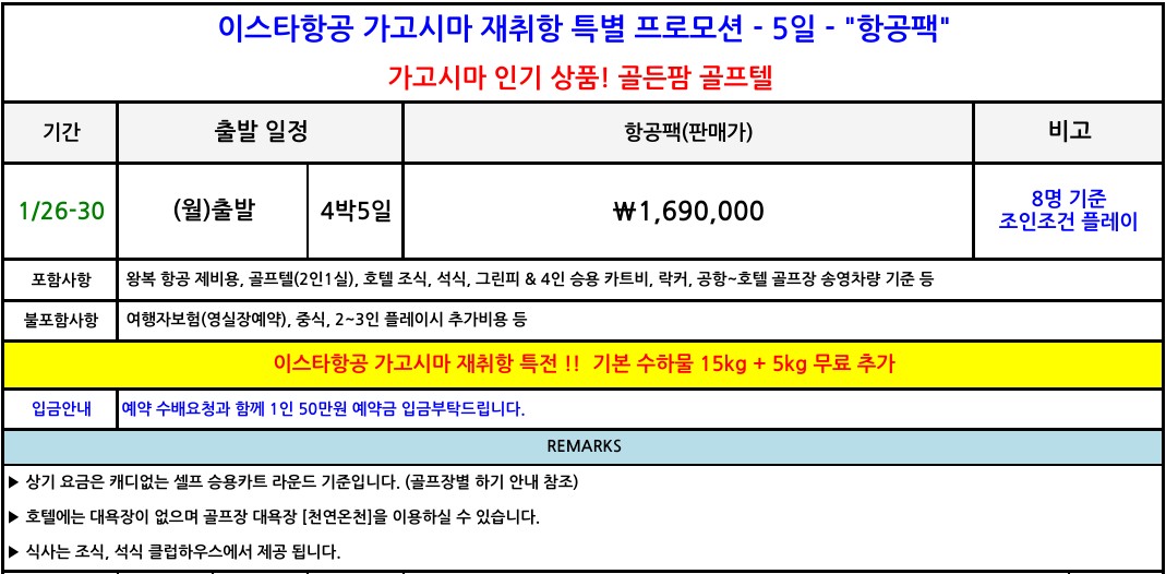 [가고시마] 1/26(월) 출발 4박5일 급모객 8인 ! 골든팜 골프텔 패키지