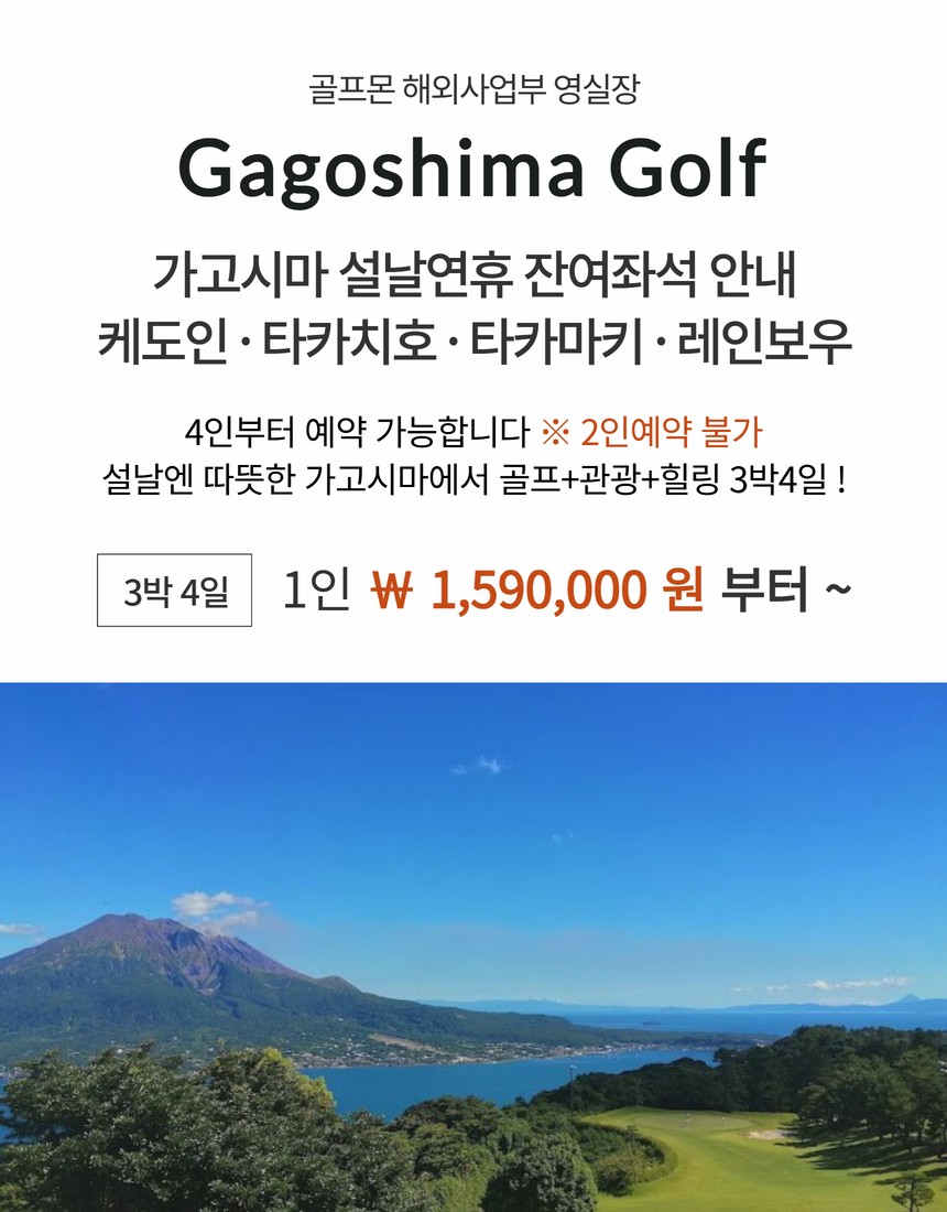 케도인 ▶ 1,790,000원 (잔여 4석) 가고시마 시내 ▶ 1,590,000원 (잔여 4석) 가고시마 타카치호 ▶ 1,990,000원 (잔여 6석) 가고시마 타카마키 ▶ 1,890,000원 (잔여 4석)