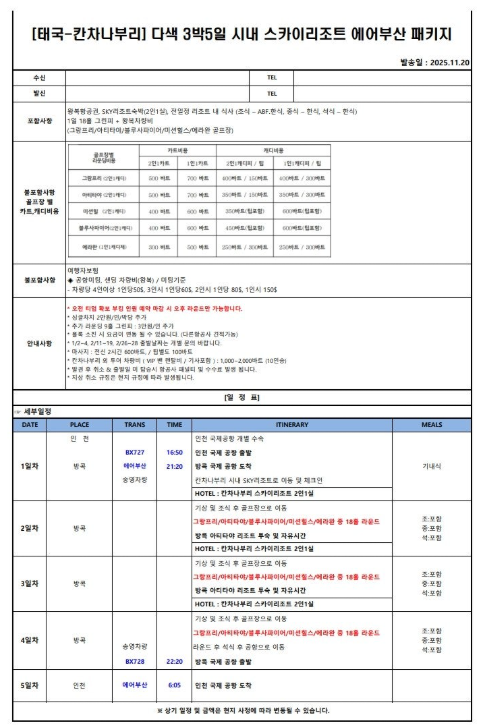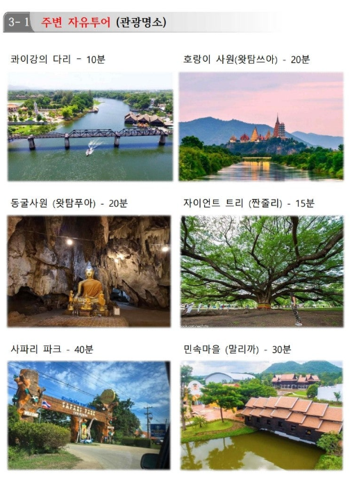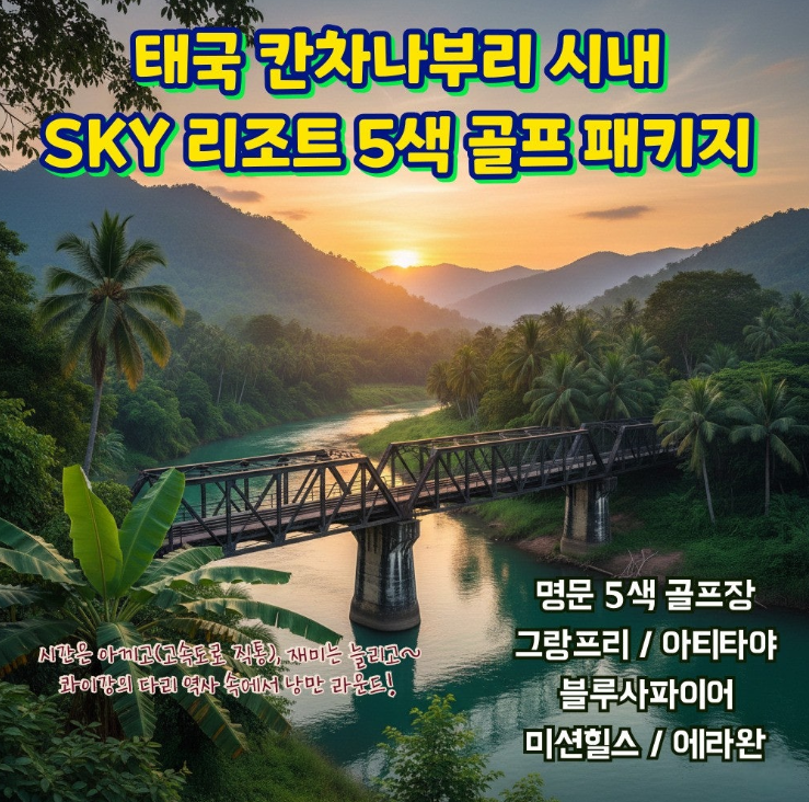 | 시간은 아끼고(고속도로 직통), 재미는 늘리고~ 콰이강의 다리 역사 속에서 낭만 라운드! 골프만 치고 끝?! NO!! 라운드 후 제대로 즐겨야죠! 항공 따로 지상만 예약 가능! 막힌 길은 뚫렸다! 방콕공항에서 칸차나부리 리조트까지 1시간 50분 쾌속 이동! (칸차나부리 고속도로 개통) 칸차나부리 5색 골프 & 관광 특급 상품 오픈! 콰이강변 럭셔리 휴식 과 매일 색다른 명문 코스! 골프 후 지루함은 NO! 콰이강의 다리, 에라완 폭포 투어! 저녁엔 야시장, 펍바, 마사지까지! 골프와 100% 만족 힐링을 찾는 분께 추천합니다. 치고! 보고! 즐기고! 칸차나부리 올인원(All-in-One) 골프 투어! 낮에는 5색 명문 코스 라운딩, 저녁에는 시내 맛집과 힐링 마사지! 매일 색다른 골프: 그랑프리, 아티타야, 블루사파이어, 미션힐, 에라완 등 명문 코스를 매일 다르게 즐기는 5색(色) 골프의 진수! 지루할 틈 없는 라운드가 시작됩니다! ![]() | ||||||||