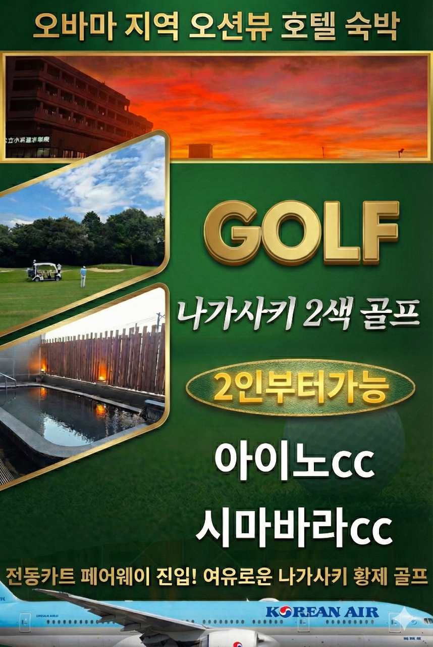 ▶아이노cc 아이노cc는 나가사키에서 가장 유명한 골프장 중 하나로, 나가사키 공항에서 차로 40분 거리에 위치해 있습니다. 구릉지대형 골프장으로 적당한 오르내림이 있어 골프를 치는 재미를 더해 줍니다. 셀프 플레이 방식으로 운영되며, 전자 유도식 카트를 이용해 편리하게 라운딩을 즐길 수 있습니다.페어웨이 카트타고 편하게 라운딩 가능 합니다.