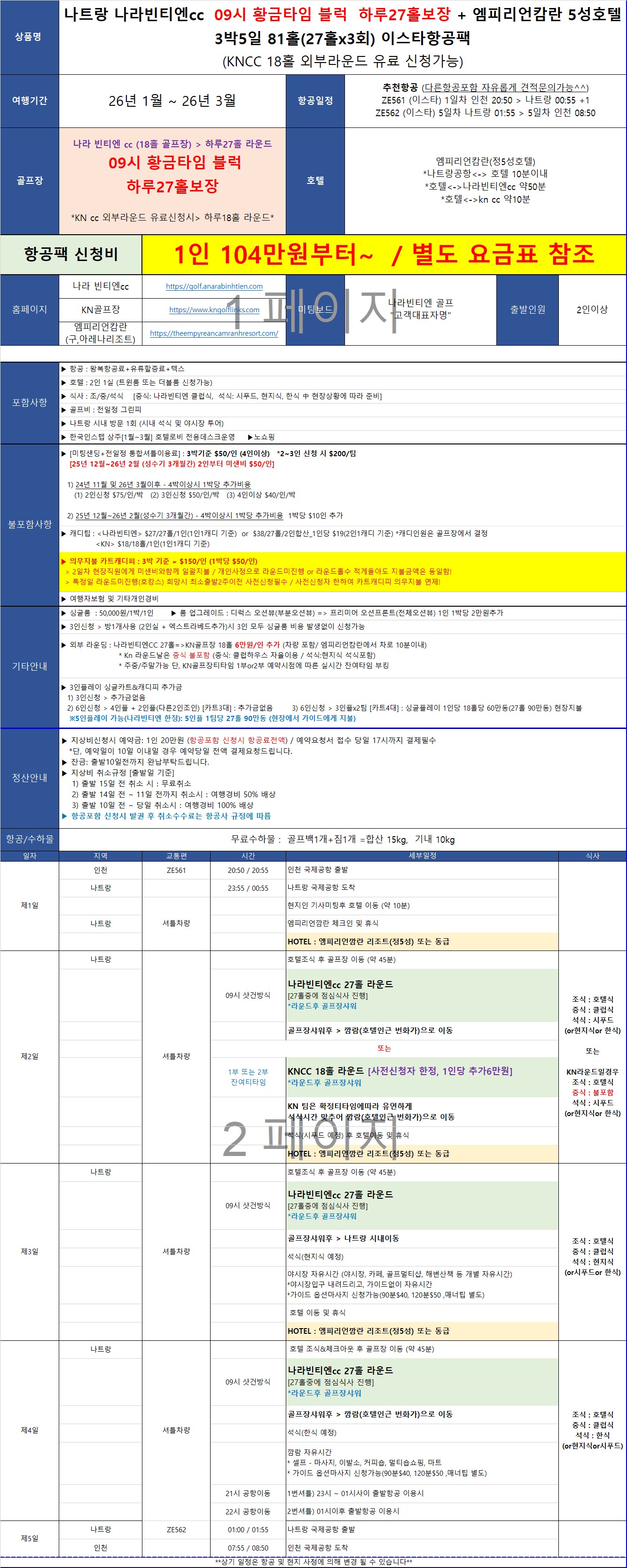 외부 라운딩 : 나라빈티엔CC 27홀=>KN골프장 18홀 6만원/인 추가 *단, kn라운드 날짜는 중식불포함