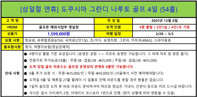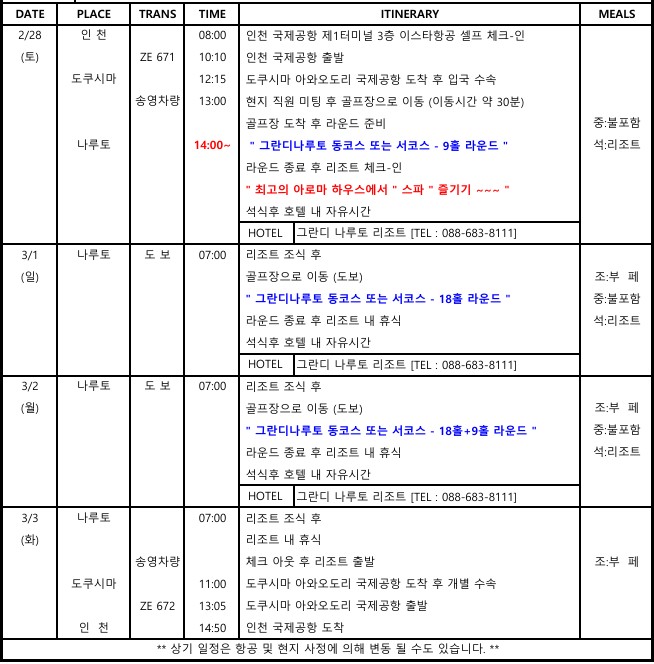 [도쿠시마] 2/28 출발 - 골프+스파 3박4일 패키지 (삼일절 연휴기간)
