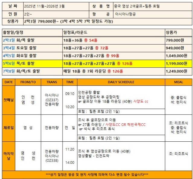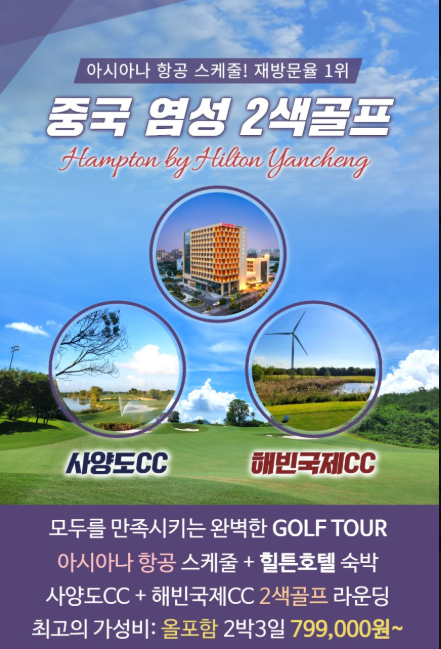 2021년 리노베이션을 통해 재오픈한 힐튼호텔은 250여개의 객실을 보유하고 있는 염성 시내에 위치한 특급호텔입니다. 현대적인 인테리어를 갖추고 있고 친절한 서비스와 깨끗하고 넓은 객실, 특히 호텔 바로 앞에는 스타벅스와 KFC가 있고 대형 쇼핑센터와 호텔이 바로 연결되어 있어 저녁 식사후 쇼핑등 다양한 활동을 할 수 가 있습니다 또한 도보로 10분거리에 재래시장이 있어 골프 & 관광 모두의 만족을 드릴 수 있는 호텔입니다 🌸힐튼 호텔 조식🌸 | ||||||||