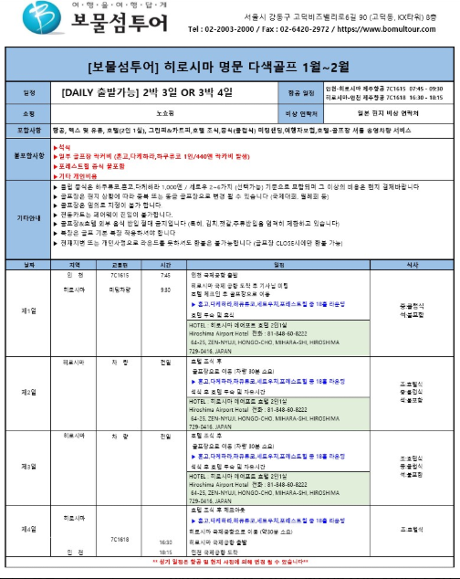 [히로시마골프] 1~2월 명문 다색 골프 항공팩 3일/4일