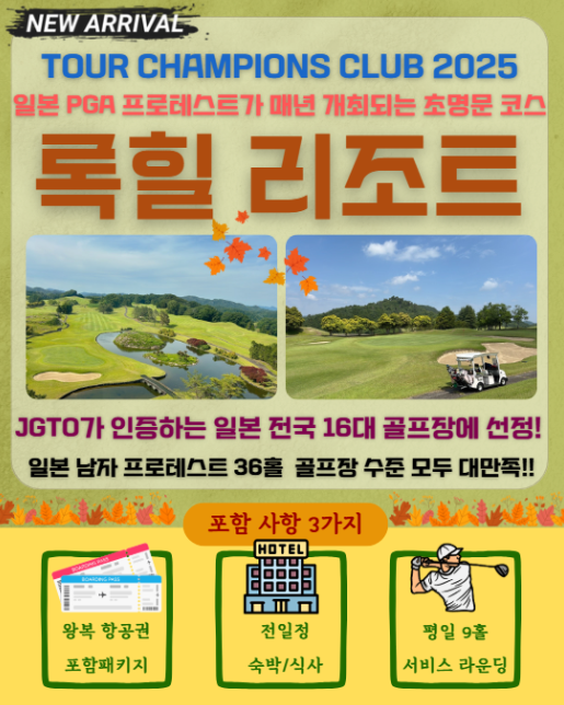 | 3·1절 황금연휴 월클 명문코스 × 연휴 기획특가 주말 27홀 → 서비스 9홀 추가! 총 126홀 라운딩 제공 ✔ 일본 전국 16대 명문 골프장 ✔ 36홀 규모 록힐GC ✔ 라운딩 후 온천 힐링 리조트 숙박 ✔ 조·중·석식 올~포함 🛍 이온몰 쇼핑 일정 포함 1/16 이후 발권 시 항공요금 인상 예정 ![]() ![]() ![]() ![]() | ||||||||