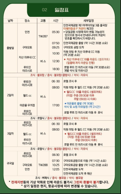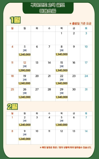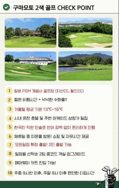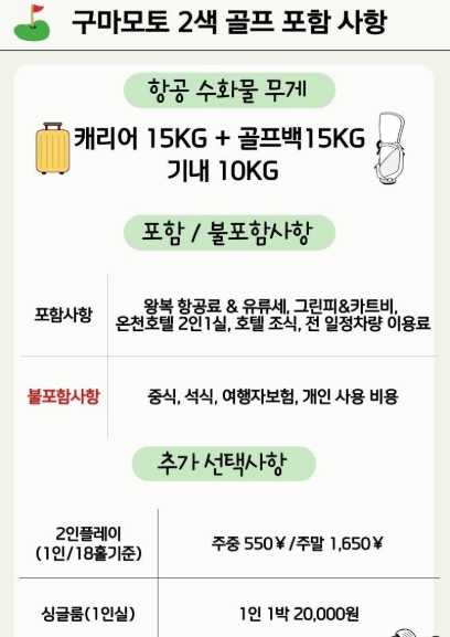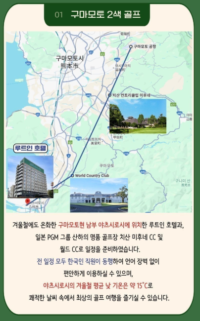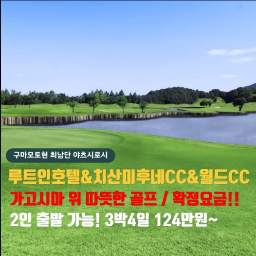 | 항공 포함 상품이며, 전일정 골프장과 차량 모두 현지 직수배 확보 되어있습니다. 119만원~ 부터 요금 입니다 ~ 월~목 / 목~일 3박 가고시마 바로 위 구마모토 남쪽 야츠시로 2색 골프 요금 변동 없는 확정 요금입니다. ![]() ![]() ![]() | ||||||||