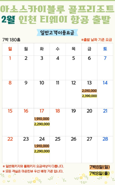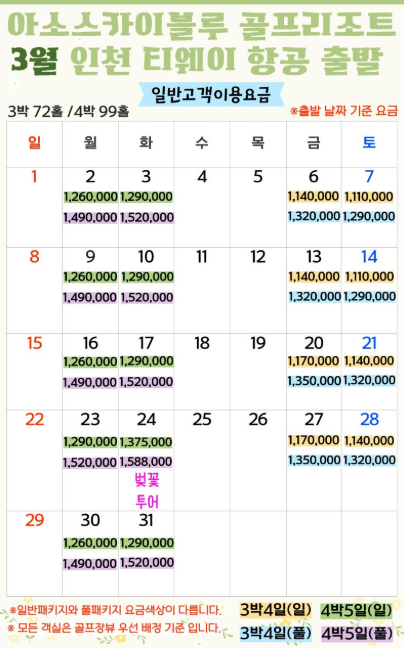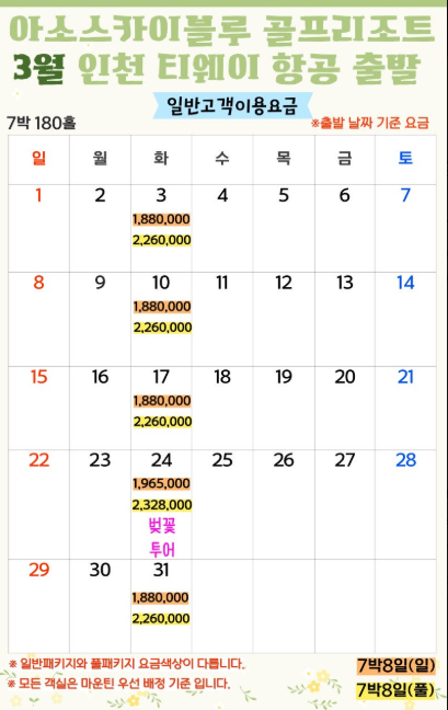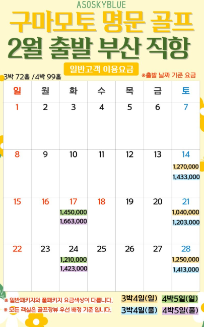 | ✈️ 항공 | -✈ 티웨이항공(인천-구마모토) ** 3박4일: (금),(토) 출발 ** 4박5일: (월),(화) 출발 ** 7박8일: (화) 출발 [2월13일 추가]