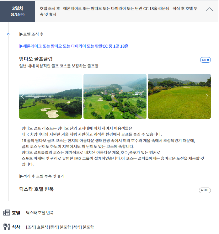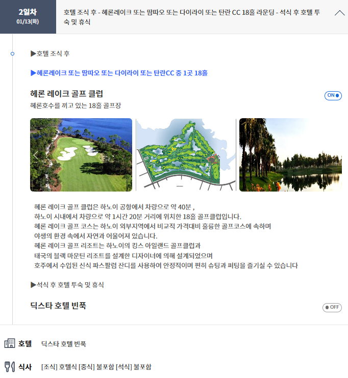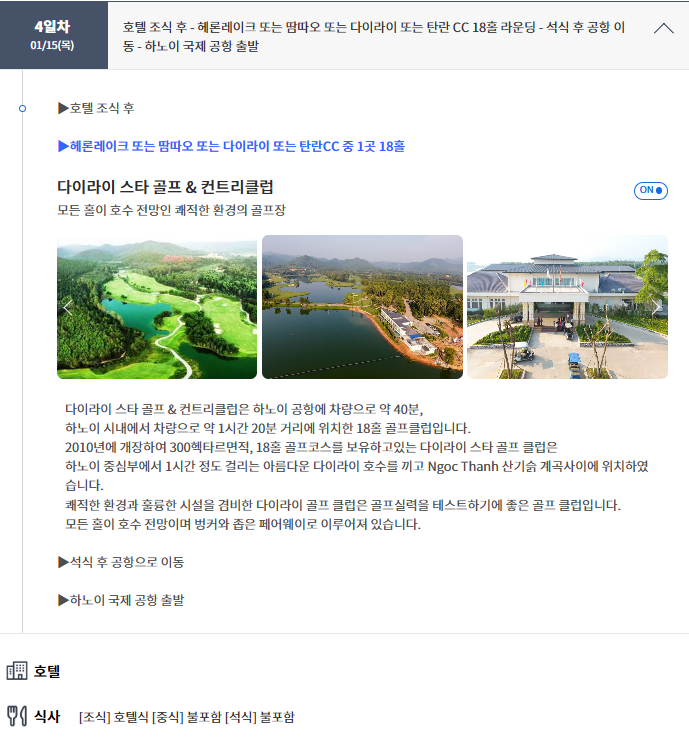 | ★ 항공은 내 마음대로?! 골프 라운딩만 패키지로 즐기는 하노이(빈푹) 골프 3박 5일 ★ 정 5성급 호텔 DIC STAR 호텔에서 3연박 ★ 공항에서 호텔까지 30분거리로 이동시간 여유로운 골프 패키지 ★ 라운딩 후 호텔에서 10분거리에 식당, 마사지 등 접근성이 좋은 위치 ★ 오전 18홀 골프 라운딩 뿐만아니라, 원하신다면 하노이 관광도 할 수 있는 골프 패키지 항공 불포함상품입니다. 문의주시면 항공관련 안내도 드립니다. 예약문의 ☎ 010.4760.0469