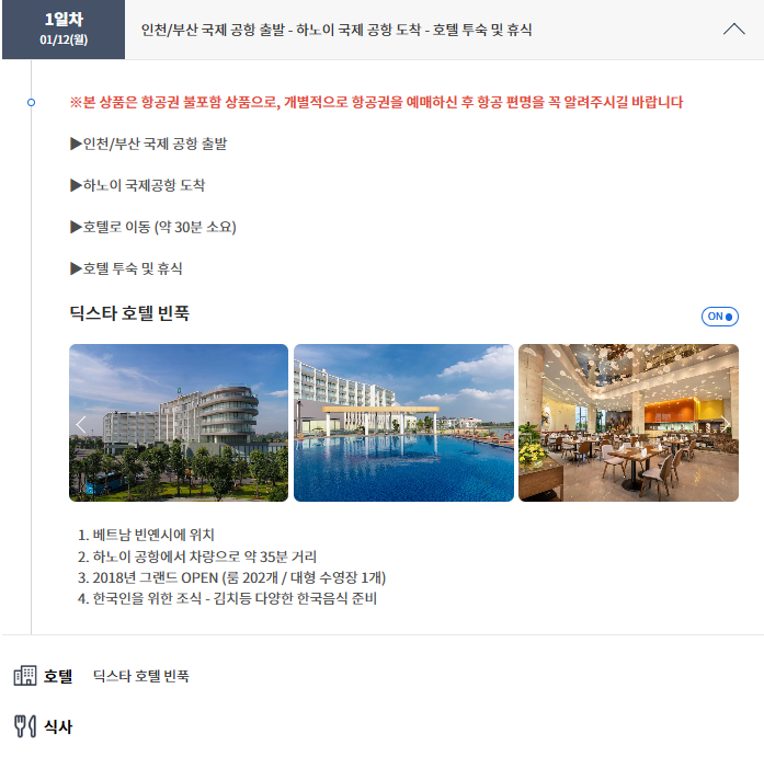 딕스타 호텔 빈푹 (5성급) 1. 베트남 빈옌시에 위치 2. 하노이 공항에서 차량으로 약 35분 거리 3. 2018년 그랜드 OPEN (룸 202개 / 대형 수영장 1개) 4. 한국인을 위한 조식 - 김치등 다양한 한국음식 준비