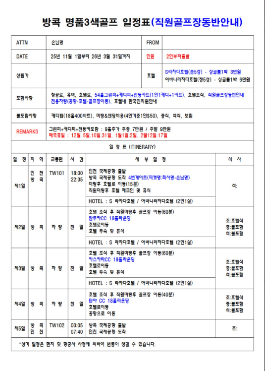 | ❌ 불포함사항 | - 클럽중식.석식 - 캐디팁(400바트) - 미팅&샌딩비용(4인기준1인$50)