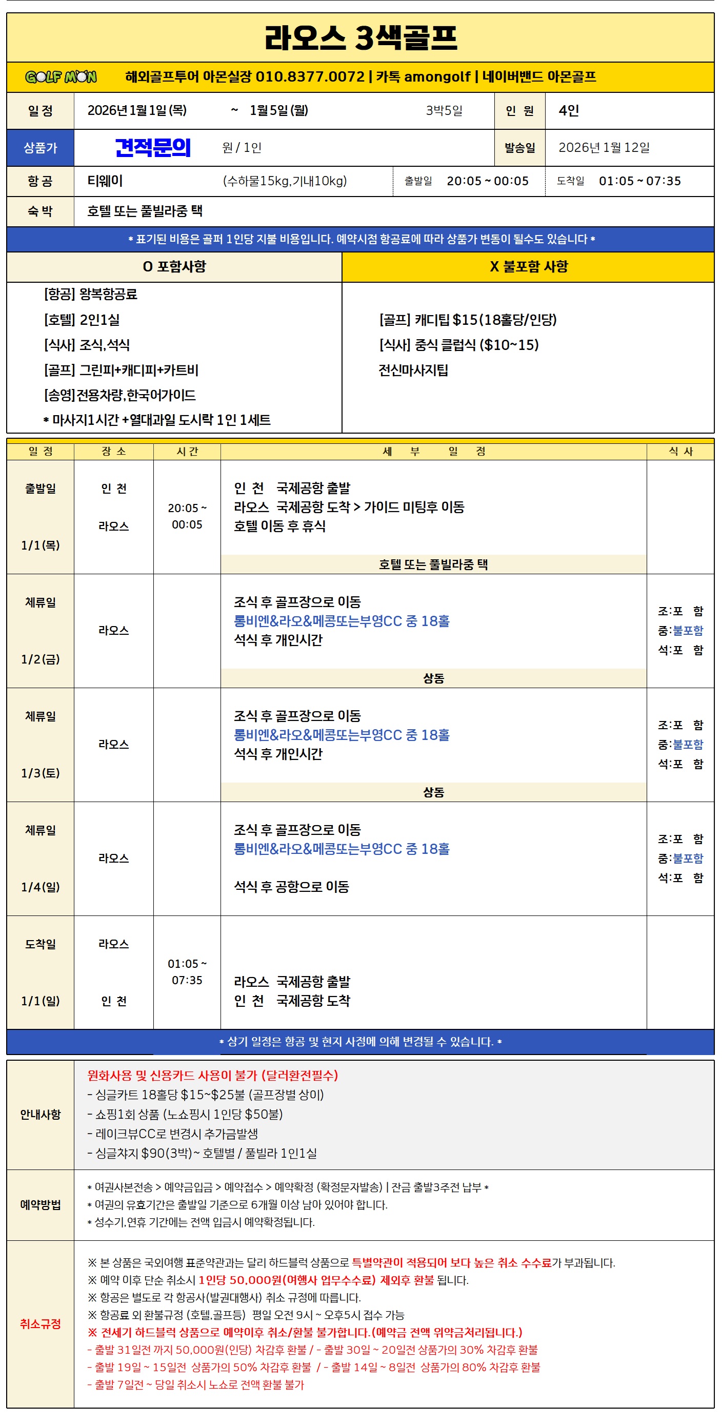 | 한국인 가이드가 함께하는 라오스 3색골프 4명부터 출발가능 단독투어진행 가능 여행의 피로를 풀어줄 전신마사지1시간 맛있는 과일도시락 제공! 지금 여유로운 라운딩을 즐기려면 라오스로 떠나보세요.