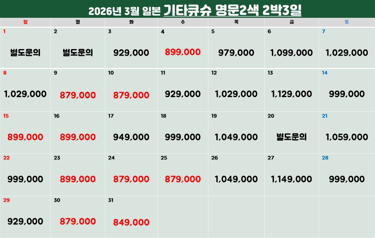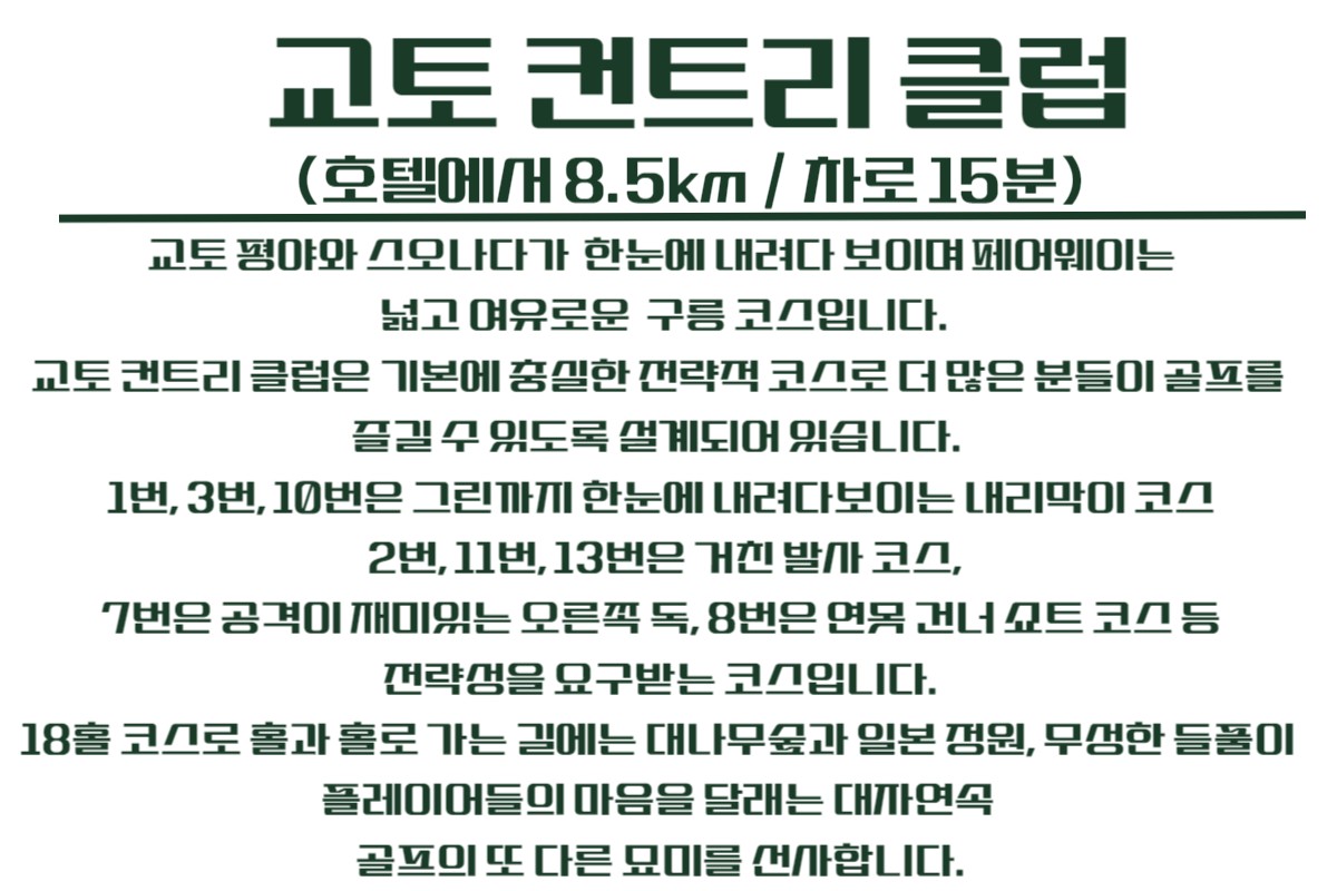 ▶전동카트 페어웨이 진입 혹은 리모컨식 카트 사용! 편안한 라운딩가능. ▶일본 직원 및 한국인 직원 현지 상주로 책임 있는 진행 (단 팀별 가이드 아님) ▶주변 맛집 안내지도 제공 및 상주 직원의 설명으로 맛집 탐방 가능! ▶송영차량은 호텔-골프장-공항만 셔틀 운행(개인적으로 다른 곳에 사용 불가) ▶송영차량은 동 시간대 다른 팀과 동승 할 수 있습니다. ▶송영비는 1인 8천엔입니다. (2인 이상 동일) ▶2인 신청과 2인 라운딩 가능 (단 주말은 혼잡시 간혹 조인 요청 있을 수 있음) ▶2인 출발시 추가금 발생 ▶싱글룸 1박/1인/1만원 추가 ▶라운딩은 캐디 및 도움 없이 고객의 풀 셀프 라운딩 기준입니다. ▶클럽 중식은 기본 1100엔 기준이며 그보다 비싼 음식은 차액 지불조건! ▶골프장은 현지 상황에 따라 2곳의 명문 골프장을 이용합니다. ▶주중 서비스 9홀은 골프장 풀티등의 사정으로 제공되지 않을수 있음(서비스=환불X) ▶골프장은 임의로 지정이 불가 합니다. |