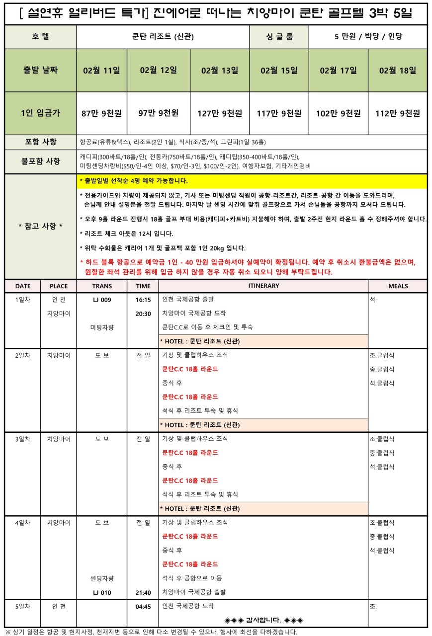 | ⭕ 포함사항 | 왕복항공권(유류/TAX) 리조트 2인1실 조식 중식 석식 전 일정 그린피 여행자보험 무료가입(영실장예약)