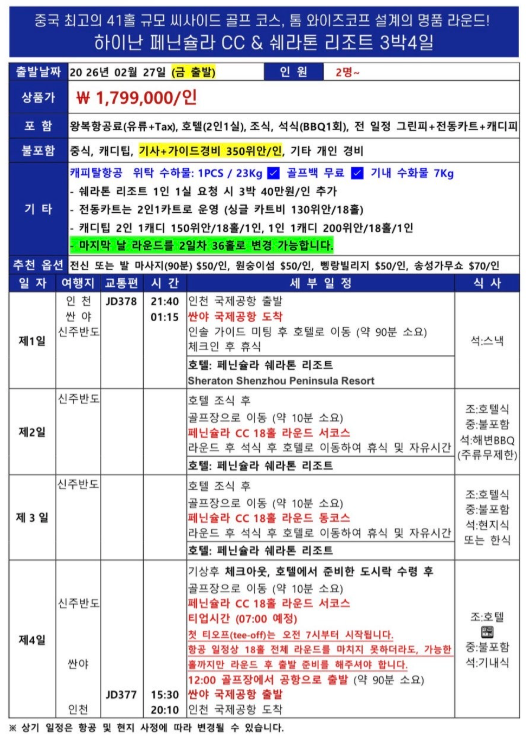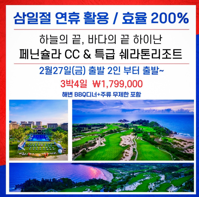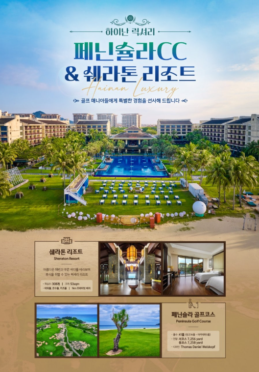 | 최상의 라운드 퀄리티와 휴식을 동시에 추구하는 골프 매니아라면, 반드시 경험해야 할 최고의 명문 코스. 하이난 페닌슐라 CC × 특급 쉐라톤리조트 2인 출발 가능 🏌️🏌️ 넓은 바다와 함께하는 진정한 골프 휴양지‼ 이용 호텔 : 특급 쉐라톤 리조트 출발일: 2월 27일(금) 밤 비행기 포인트: 삼일절 연휴 활용 / 효율 200% 일정 ✈ 3박4일(금) ₩1,799,000 * 중국 최상급 41홀 씨사이드 코스에서 펼쳐지는 품격 있는 라운드!! - WHY 하이난 페닌슐라? ✔ 리조트↔골프장 최단 동선 이동, 편리한 일정 ✔ Tom Weiskopf 설계 ✔ 전용 프라이빗 비치에서 즐기는 여유 ✔ 쉐라톤 리조트의 풀장·미식·휴식 완비 ✔ 도보 20분 — 먹자거리 & 스타벅스 & 저녁까지 즐기는 상권 ![]() ![]() ![]() | ||||||||