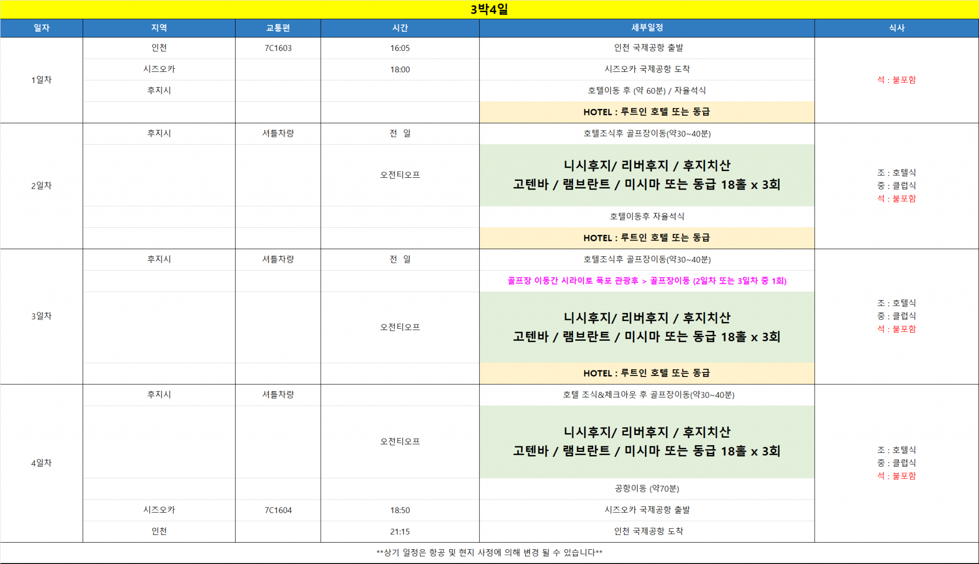 시즈오카 후지산3색 겨울골프 항공팩134만~ 26년1~3월 3박54홀 블럭항공(수하물20kg) - 26년 1~3월 매주 일134만~, 목152만~ - 4인이상 다른요일 출발가능 - 골프치며 눈덮인후지산 인증샷 - 동계골프 해발낮은 골프장부킹 > 낮기온 10도 - 한국인안내원/석식외올포함/대욕장호텔+시라이토 폭포 관광포함 | ||||||||