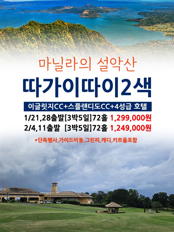 인천출발 출발: 2/4,11출발 [3박5일] 72홀 항공: 제주항공 (위탁수화물15KG) 인원: 2인부터 예약가능 요금: 인/1,249,000원