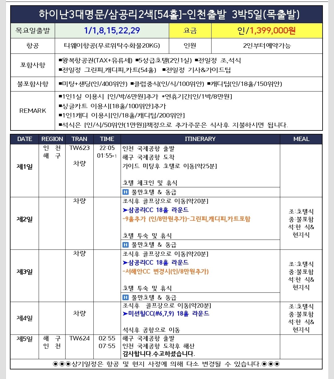 | 🧳 출발일&금액 | 출발 ▶ 1/1,8,15,22,29출발 (3박5일) 항공 ▶ 티웨이항공 (위탁수화물 20KG) 인원 ▶ 16석한정 (2인부터 예약가능) 요금 ▶ 인/1,399,000원