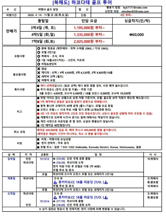 | 🚩 기타안내 | ■ 싱글차지 6만원/인/박 ■ 캐디 선택제입니다. (팁은 선택) 캐디 동반 원할 경우, 사전 예약 필수입니다. ■ 추가 라운드 (현지 요청 및 지불) - 주중 기준 9홀 프린스 4,000엔, 오누마 6,000엔 / 18홀 프린스 8,000엔, 오누마 10,000엔 ■ 전담 가이드 없는 상품으로 송영차량 기준이며, 호텔, 골프장 상주 직원이 핸드링 해드립니다. ■ 7박 예약하신 분들은 일요일 일정이 관광으로 대체됩니다. ■ 원목 통나무 코테이지 40채 운영 (룸1+거실1) -호텔 요금 동일 ■ 프린스 호텔<-> 시내 무료 셔틀 정기 운행 (쇼핑&관광 편의) ■ 4인 1조 라운드 원칙이며, 2인은 조인 라운드입니다. (3인시 골프장 상황에 따라 조인될 수 있음) ■ 개별적으로 외부에 나가서 생기는 일에 대해서는 책임지지 않습니다. ■ 개인 사정으로 라운딩을 못 할 경우, 요금은 환불되지 않습니다. ■ 1인 예약금 40만원입니다.