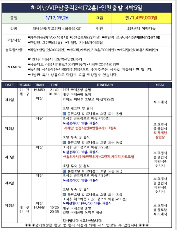 | 1월지정일 해남항공 특가! 비슷할수는 있어도 같을수는 없습니다.! 명실상부!하이난 해구 3대명문골프장 [삼공리+미션힐+서해안(선택가능)] 이왕가시는 해외골프여행 최고급골프장,최고급호텔이 낫지않을까요?^^ VIP고객만을위한 VIP골프여행 . . . 1️명실상부 하이난 하이커우 3대명문코스라운드 2️해남항공 실시간항공,무료수화물 32KG 3️최고급코스 "삼공리CC" "서해안CC"미션힐CC" 4️특급호텔이용-풀만 & 르네상스호텔 손님후기 페어웨이가 한국퍼블릭골프장 그린같아요~ ♂️골프장 풍광이 너무 아름다운 관광지 같아요~ ♂️캐디님들 빗자루로 페어웨이 쓸어요 ㅎ 관리짱 ㅎㅎ~ 호텔 야외온천, 다양하고 정말 좋아요~ ♂️공항-호텔-골프장이 가까워서 좋아요~ 호텔바로옆이 식당가라 밤에 이용하기 좋아요~ | ||||||||
