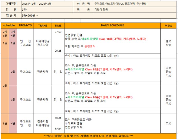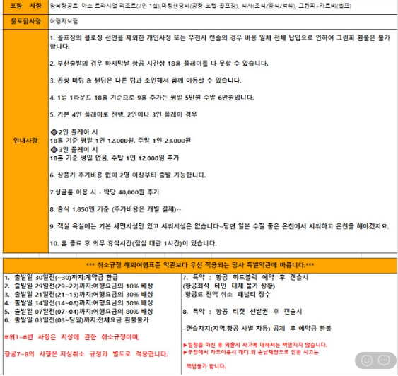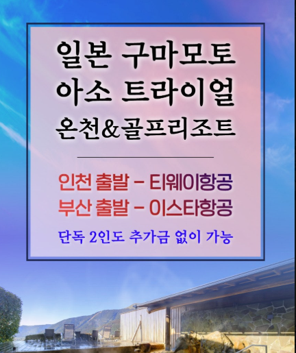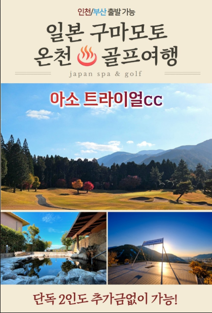 | 아소트라이얼cc 골프 무조건 선택이유!! 2인 단독 출발해도 추가 비용없습니다. ↪공항~골프장 30분 내외 짧은 이동으로 아소산 고지대의 맑고 시원한 공기와 자연산림과 계곡들이 함께 조화로운 국립공원의 대자연 한가운데에서 플레이를 즐기며, 여름에는 쾌적한 기온으로 겨울에는 평균 15도내외의 라운딩하기 최적의 컨디션↩ ↪일본 최대의 칼데라 화산인 아소산의 웅장한 풍경을 배경으로 라운딩 하면서 매홀마다 저절로 감탄을 자아내는 풍경↩ ↪일본의 유명 유통기업 Trial Holdings가 직접 운영하는 고품격 컨디션으로 철저하고 뛰어난 코스 관리와 빠른 그린의 속도와 페어웨이 잔디 상태가 최고↩ ↪전동카트 페어웨이 진입 가능(일부홀 제외)으로체력적인 부담 없이 편하게 플레이 가능하며, 전동카트 + GPS 한국어 내비지원으로 편리한 플레이↩ ↪골프 후 천연온천, 노천탕, 사우나까지 하루의 피로를 따듯한 리조트 내 노천탕이나 대욕장에서 온천욕을 즐기며,특히 바깥 공기가 차가운 겨울 저녁, 따뜻한 온천수에 몸을 담그며 하루의 피로를 푸는 시간은 정말 하루 최고의 순간↩ ↪겨울 골프의 묘미를 제대로 느낄 수 있으며, 조식.중식.석식 제공으로 편안한 식사와 함께 일본 고유의 요리를 즐길 수 있습니다.↩ ![]() ![]() ![]() | ||||||||