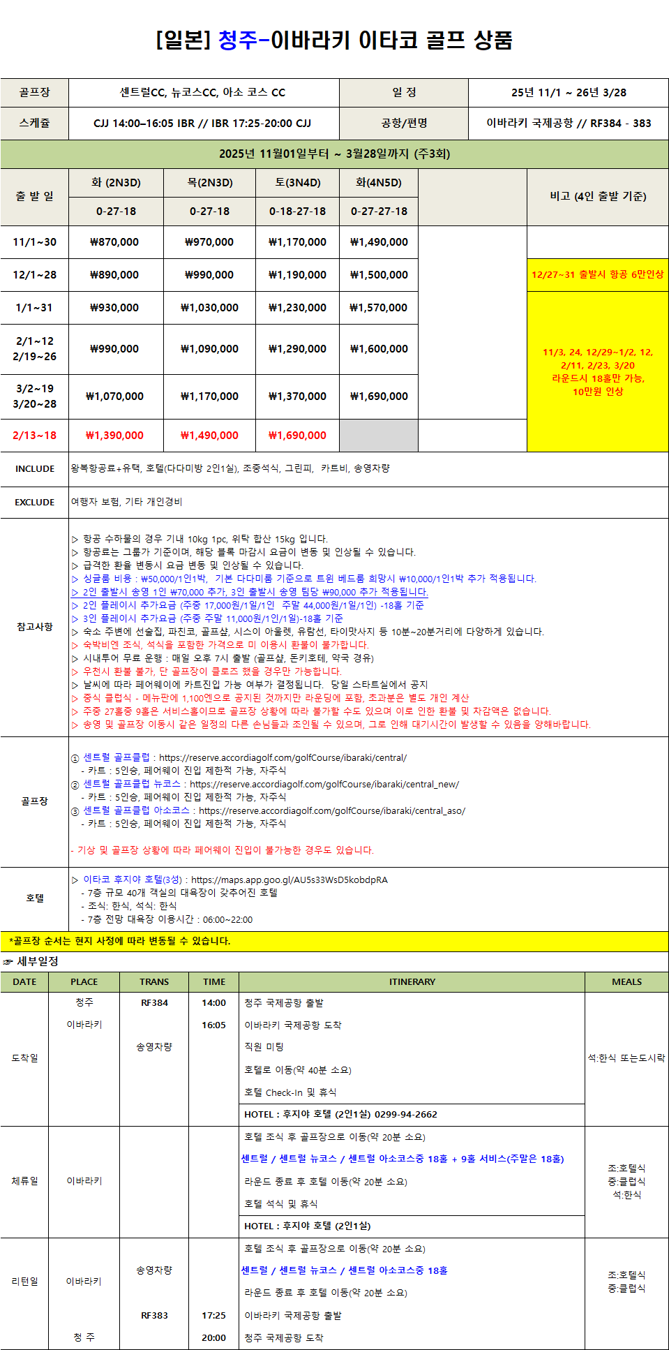 | 🚩 기타안내 | 이바라키 공항 > 호텔 (40분소요) > 골프장 (10분 ~15분 소요) > 공항 (40분 ~50분소요), 호텔 > 이타코 시내 (걸어서 10분 내외) 호텔 > 골프 5, 돈키호테, 와규 맛집등등 (30분 소요)
