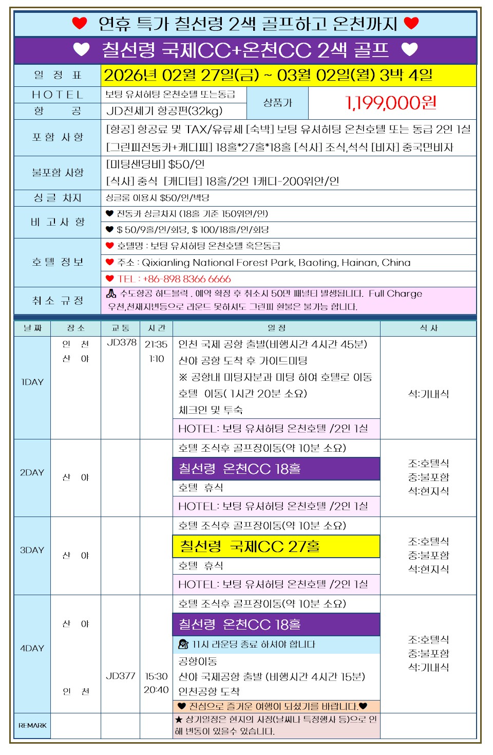 ![]() ★ 중국수도항공 왕복 탑승 (저녁 출발 - 저녁 도착) ★ 국제CC + 온천CC 2색으로 즐기는 즐거운 라운딩! | ||||||