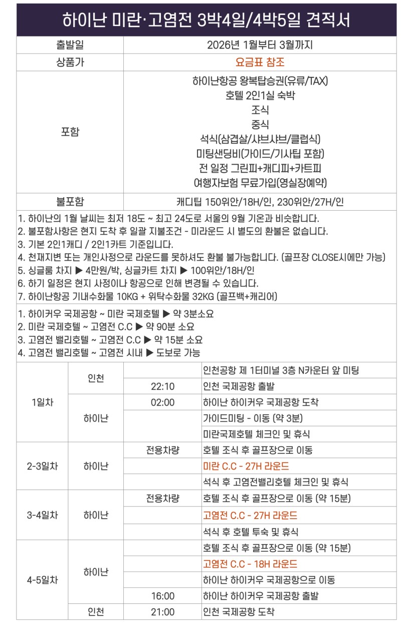 [하이난] 1/20 기준 잔여좌석 안내 / 팁 제외 모두포함 미란+고염전 2색골프 패키지