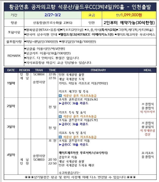 | 봄이 일찍오는 공자의고향 "곡부" 직장인도 휴가가 필요없는 삼일절 황금연휴 중국골프여행 30석한정이니 서두르세요~ "2/27 밤출발 3박4일(90홀) ⛳️공자의고향 "취푸/금우골프클럽" 1️ 전일정 식사,그린피,캐디피,카트올포함 2️ 특석식2회포함(샤브샤브,무제한삼겹살) 3️ 웰컴드링크-HOT또는ICE아메리카노한잔서비스