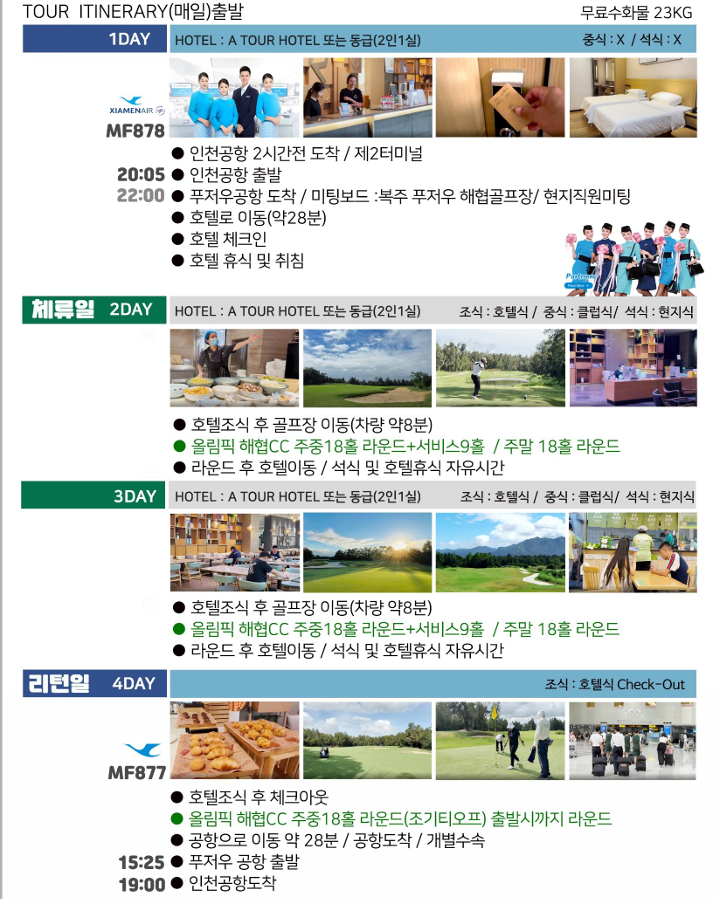 ★ 평일 9홀 서비스 라운드 제공 ! ★ 편리한 동선, 깨끗한 도시~ ★ 2월말 평균기온 14도 ~ 20도 ★ 위탁수화물 넉넉한 23KG 까지 제공 | ||||||