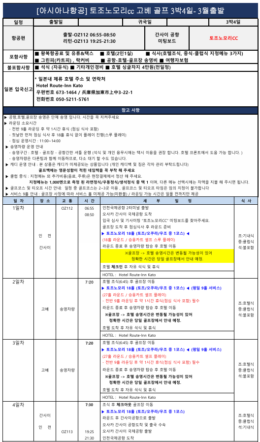 ▶ 기타 유의 사항 - 골프 라운딩은 골프장 폐장 30분 전까지만 가능/ 첫날 항공 지연등으로 18홀 라운드 불가 시 환불 불가