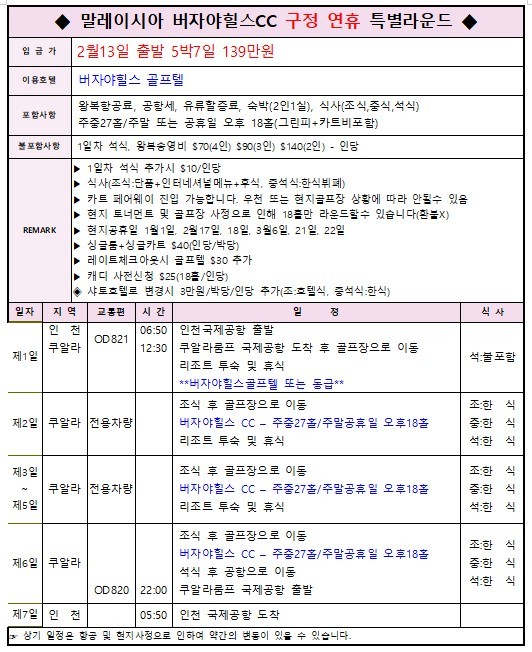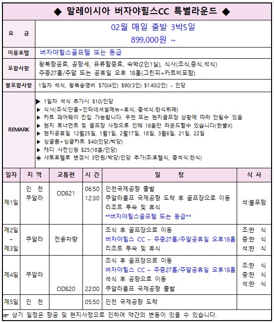 | ⭕ 포함사항 | 왕복항공권(유류/TAX) 골프텔 2인1실 조식 중식 석식 주중 27H 그린피 주말공휴일 18H 그린피 일정상의 카트피 여행자보험 무료가입(영실장예약)